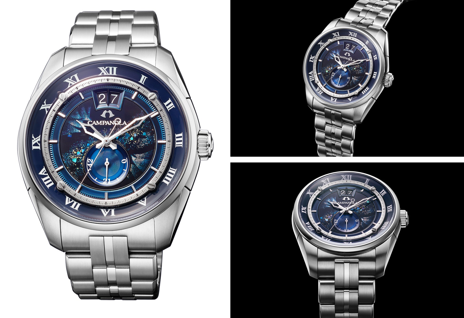 『カンパノラ』は、2000年にデビューして以来、腕時計を単に時刻を知るだけのツールではなく、「雄大な宙(そら)に想いを馳せ、今という時を愉しむ。」をテーマに掲げ、先端技術や匠の技を活かした独創的なモデルを発表し、高い評価を得てきました。ガラスに遮られたわずかな空間に、無限の宇宙を閉じ込める「宙空の美」をデザインコンセプトに、サークル形状の五徳リングなど、パーツを組み合わせた多重構造を持ち、建築物のように⽴体的な表情を醸しだすデザインが特⻑です。