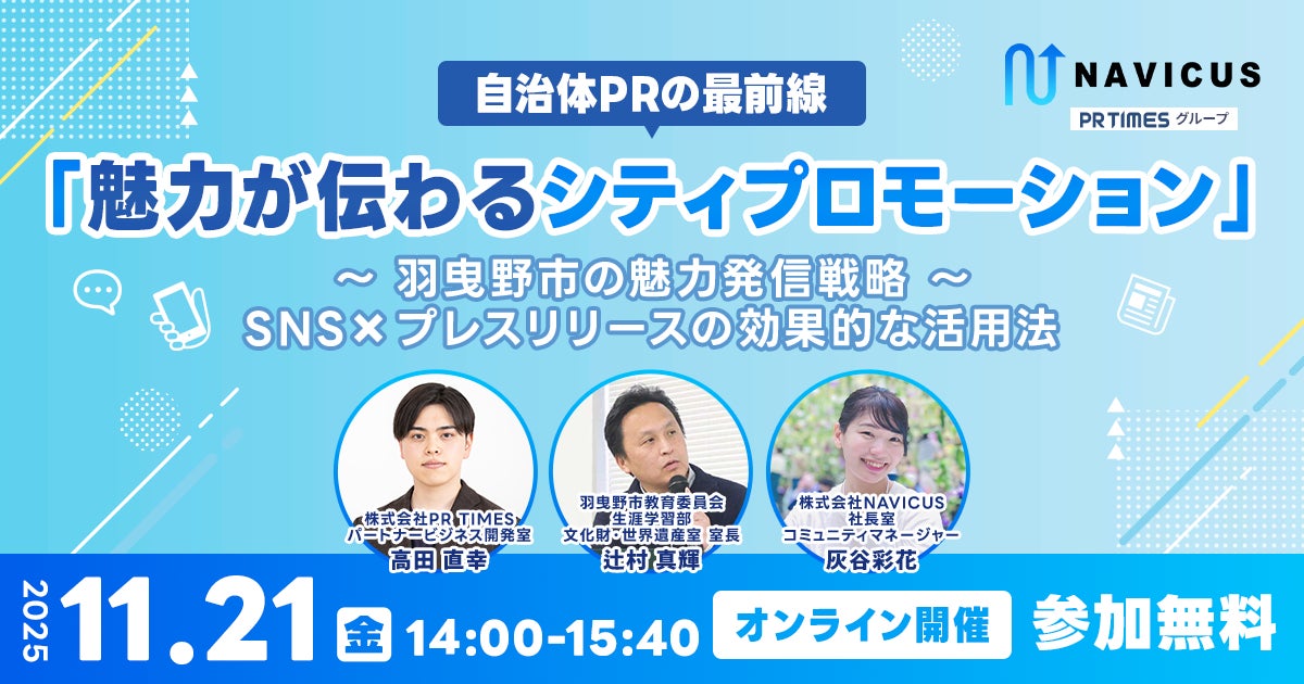 SNSを通じて企業様や地方自治体様のコミュニケーション支援サービスを提供する株式会社NAVICUS(本社:東京都千代田区、代表取締役:武内 一矢、以下:NAVICUS)は、株式会社PR TIMES(本社:東京都港区、代表取締役:山口 拓己、東証プライム・名証プレミア:3922)と共同で、2025年11月21日(金)に自治体職員を対象としたオンラインセミナー【自治体PRの最前線】『魅力が伝わるシティプロモーション』を開催します。