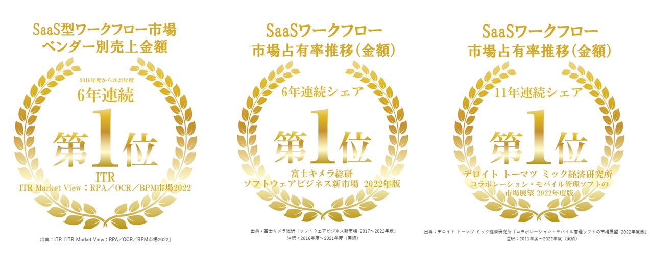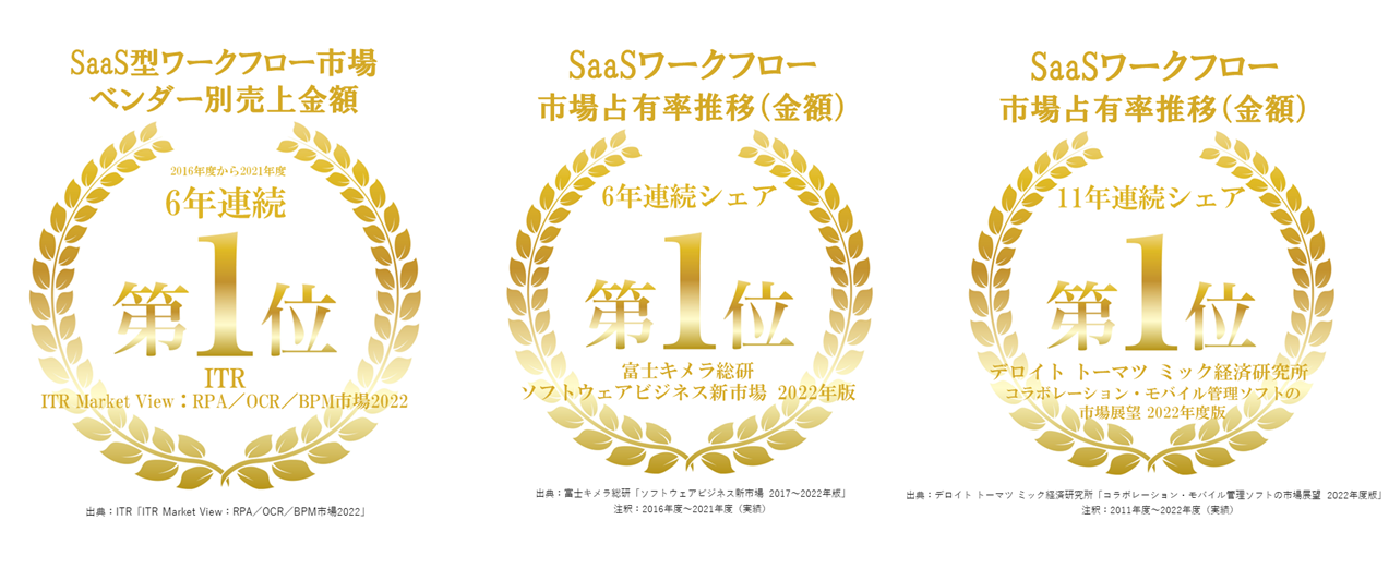 さらに、拡大を続けるワークフロー市場およびSaaS分野において、今年度も複数の市場調査レポートでトップシェア3冠を獲得するなど、高いご評価をいただくことができました。
