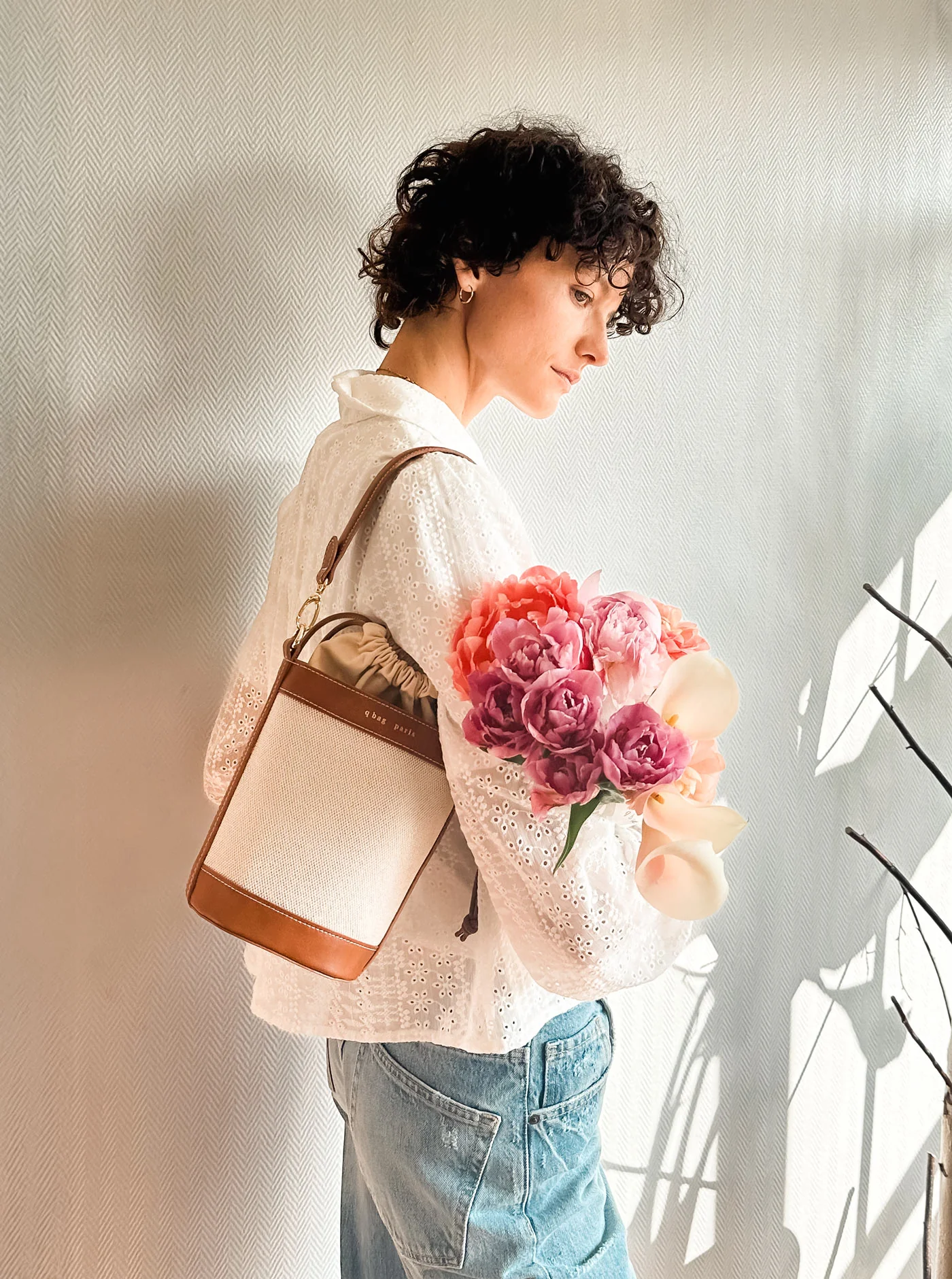 デザインのきっかけは、小さな花屋の店先に並んだバケツ。無造作に活けられた花が空に向かって誇らしげに咲いているようすにインスピレーションを得たデザイナーが直感で「これはバッグにしたい」と感じ、すぐに製作がスタートしました。