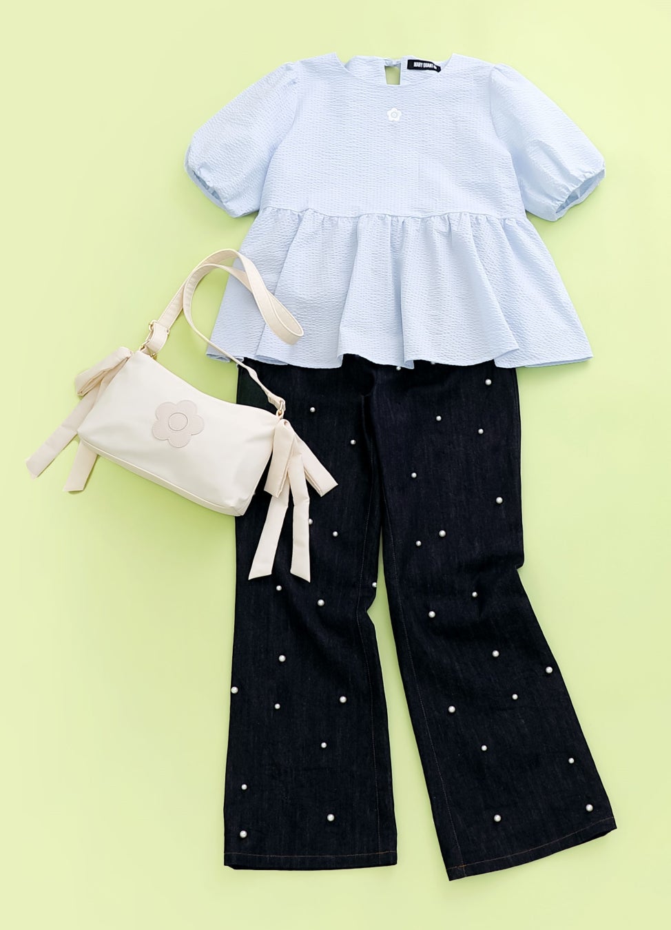 ナチュラルなカラーのビスチェとパンツは、セットアップで上品に。