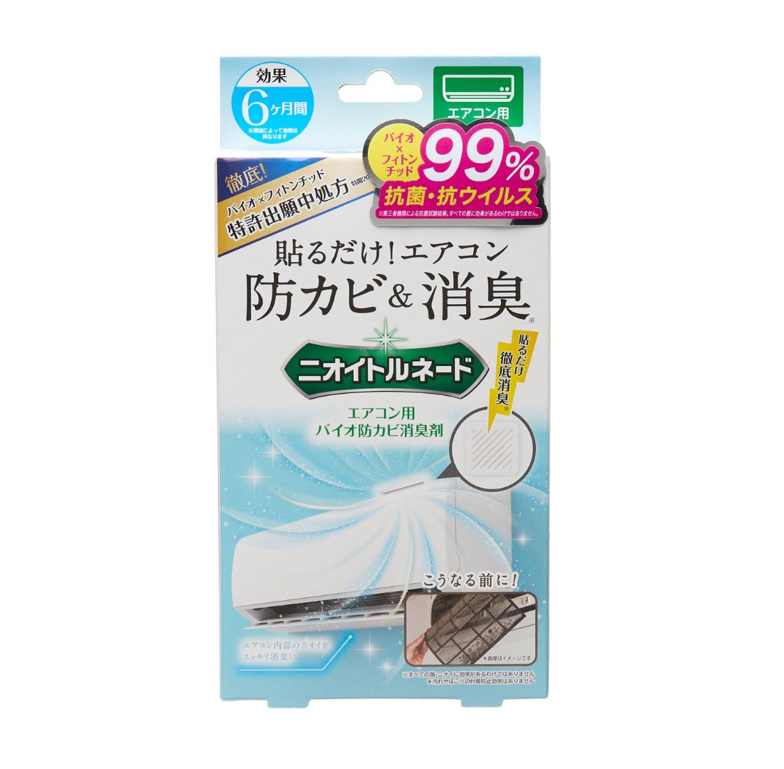 1度貼れば6か月効果が持続するため、年に2回の交換で年中キレイをキープできるエアコン用バイオ防カビ消臭剤です。
