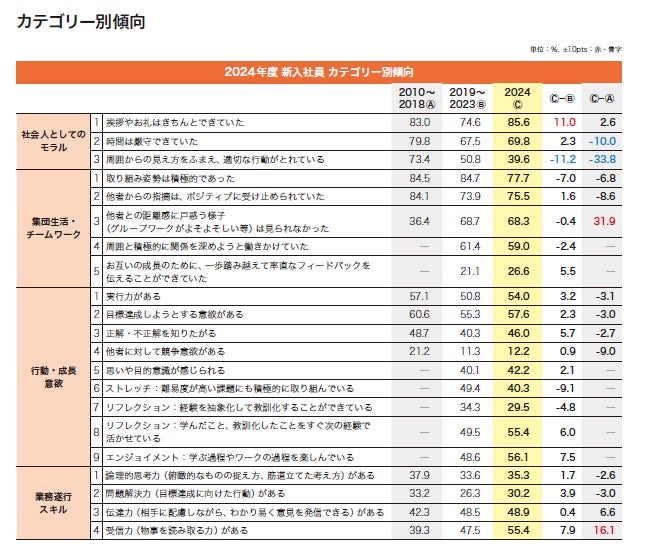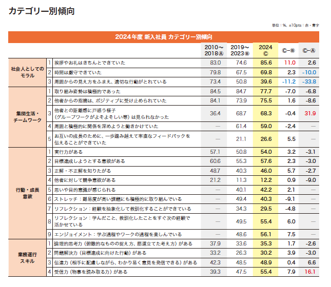 当社は、2008年より新入社員の傾向についてのレポートを発行しています。2024年度版では、当社実施の研修現場で見られた受講生の行動や態度に関するデータを収集・分析し、今年度の新入社員の特徴と、Z世代と言われる社員たちと働くヒントをお伝えします。