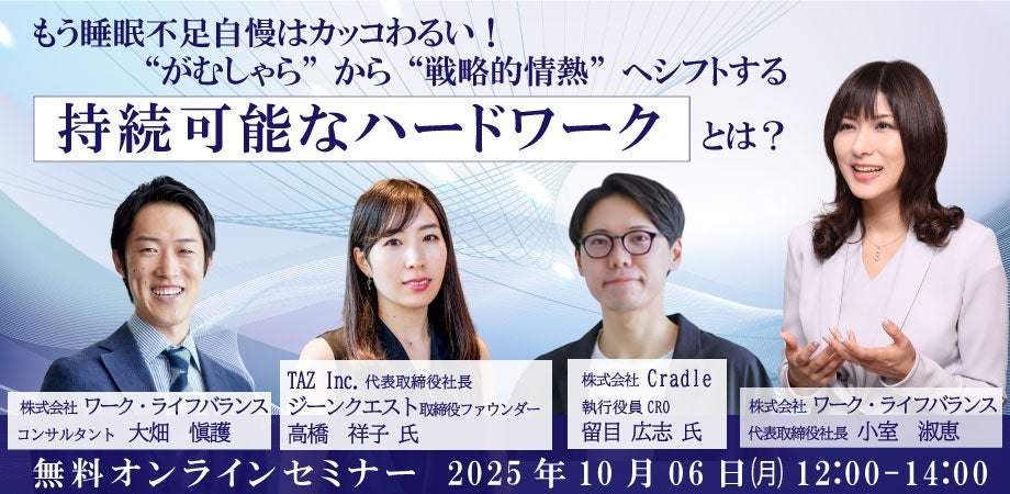 2006年の創業以来3000社の働き方改革を支援する株式会社ワーク・ライフバランス(本社:東京都港区、代表取締役:小室淑恵、以下「当社」)は、2025年10月6日(月)に、スタートアップや成長企業で成果を出し続けるための「持続可能なハードワーク」をテーマにした無料オンラインシンポジウム「もう睡眠不足自慢はカッコわるい!“がむしゃら”から“戦略的情熱”へシフトする『持続可能なハードワーク』とは?」(以下「本シンポジウム」)を開催します。