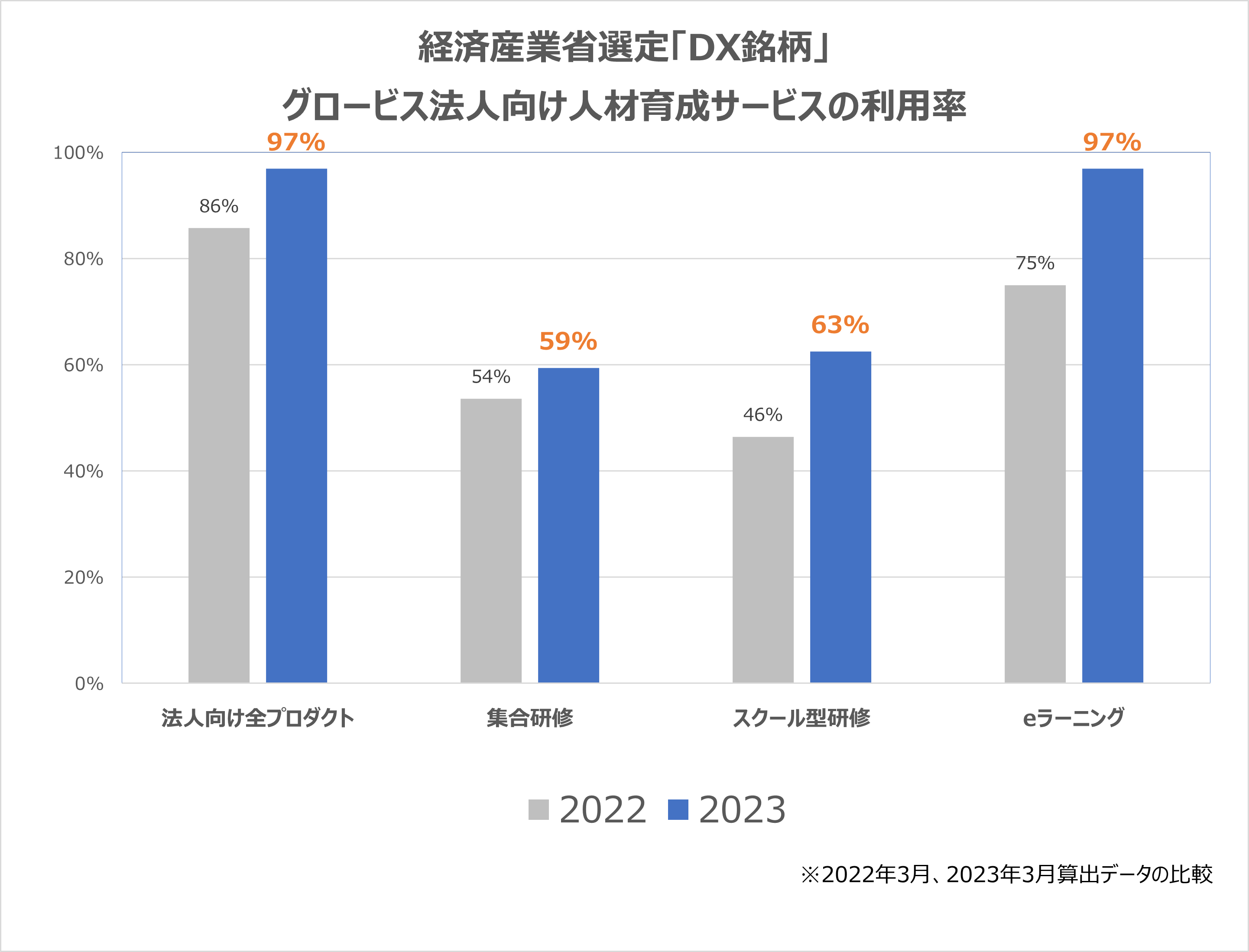 こうした中、経済産業省は企業DXを含めた戦略的なIT利活用を促進させる支援策のひとつとしてDX銘柄制度を展開。企業価値の向上につながるDX推進の仕組みを社内に有しており、かつ優秀なデジタル活用の実績を残す企業をDX銘柄*3として選定しています。そのDX銘柄のグロービスが提供する人材育成サービスを導入する企業の割合は昨年と比較して11pt上昇し、利用率は97%を突破しました。(2023年3月時点)