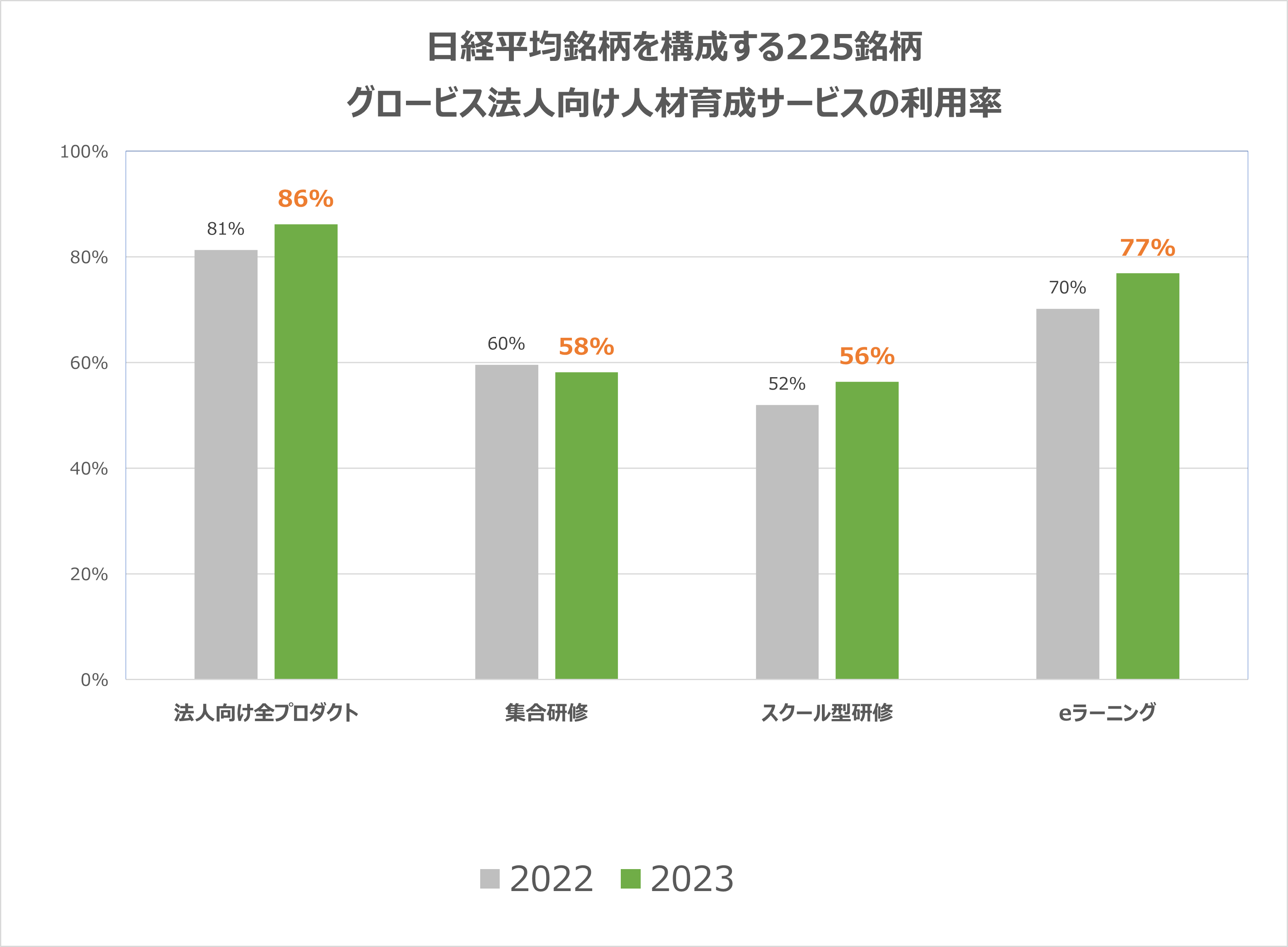 株式会社グロービス(東京都千代田区、代表取締役:堀義人)は、経済産業省などが選ぶ「DX銘柄」企業によるグロービス法人向け人材育成サービス*1の導入が、97%を突破、さらに日経平均銘柄企業に選ばれた上場企業225社の利用率は86%以上となりましたことを発表します。