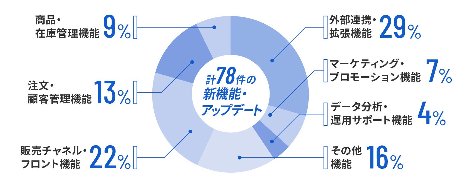 W2はお客様のEC事業の成長を支援するため、業界トレンドや市場ニーズを踏まえた機能開発・アップデートに取り組んでいます。2024年には、EC専業20年で培った豊富なノウハウを駆使して、計78件の新機能リリースや機能アップデートを実施し、EC事業者様の利便性向上やサイトユーザーの満足度向上に貢献してまいりました。