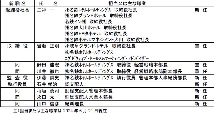 監査役 稲垣 勇司、 執行役員 総支配人 島原 東ならびに執行役員 総料理長 早坂 敏夫は2024年6月19日付で退任致しました。在任中に賜りましたご厚情に厚く御礼申し上げます。