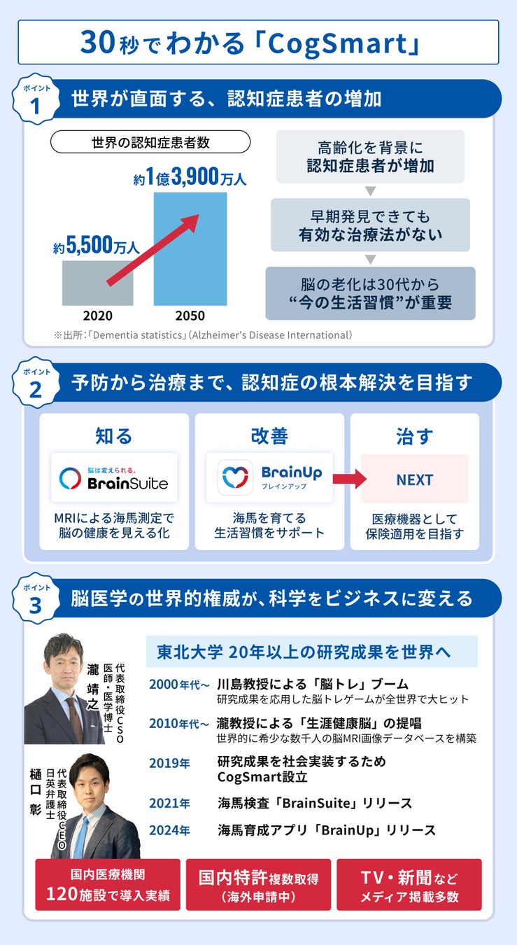 【東北大学発】脳医学の権威が「認知症」に挑む。予防から改善まで最先端研究をビジネスに変える「CogSmart」、イークラウドでの資金調達を10月23日に開始