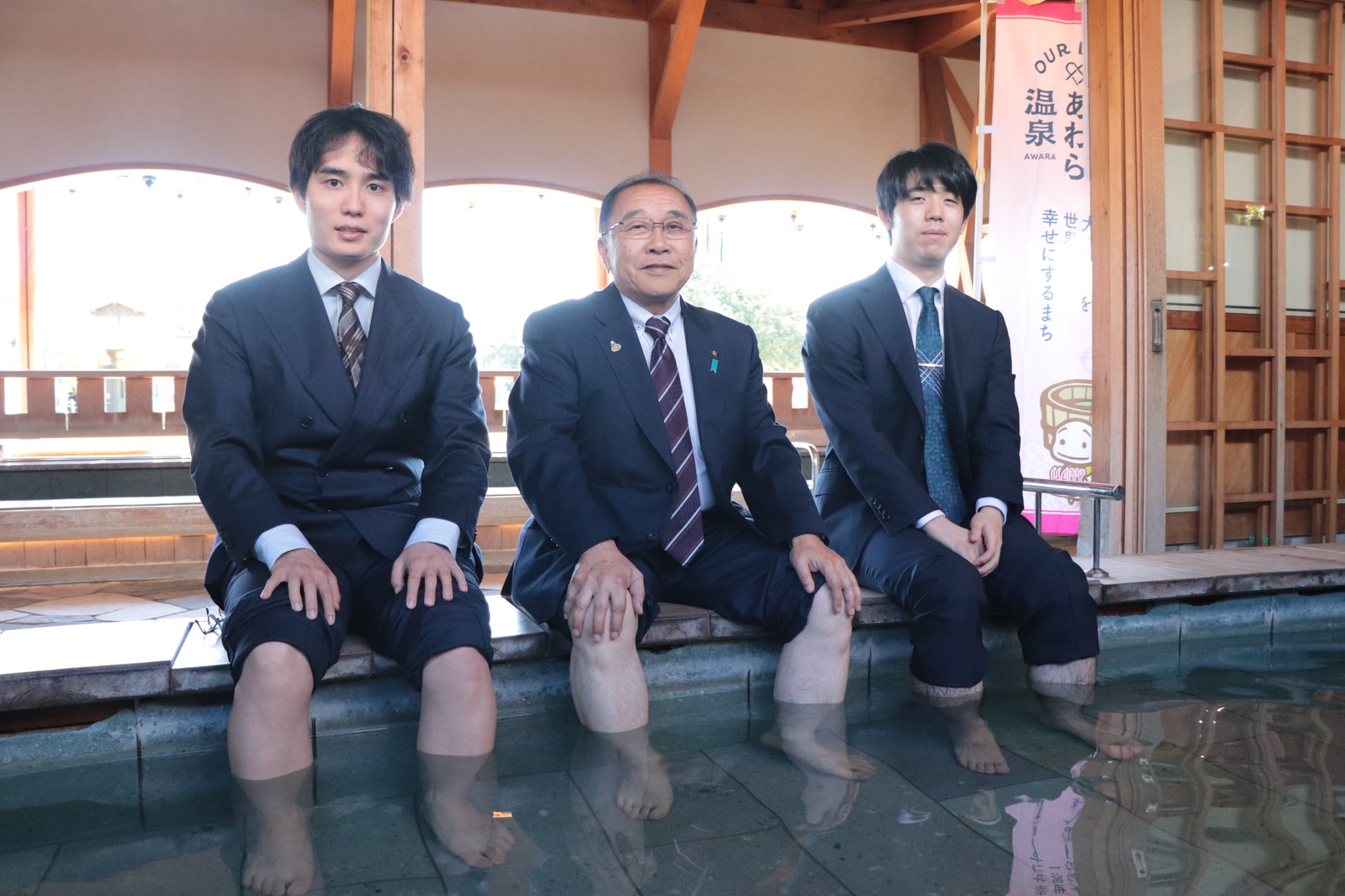 竜王戦翌日、藤井聡太竜王と佐々木勇気八段、あわら温泉『芦湯』でフォトセッション!2種類の源泉と福井の笏谷石を使った足湯で癒やしを