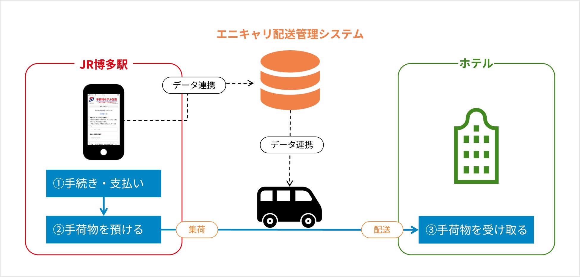 ラストマイル物流に特化した物流ソリューション事業を展開する株式会社エニキャリ(以下、エニキャリ)は、JR九州商事株式会社(以下、JR九州商事)と提携し、7月29日より手荷物のホテル当日配送サービスを開始しました。具体的には、JR博多駅でスーツケースやボストンバッグなどの手荷物を預かり、福岡市中心部のホテルへ当日配送するものです。利用者専用のスマホサイトはインバウンド向けに多言語対応[日本語、英語、中国語(簡体字・繁体字)、ハングル語]しています。このサービスは、観光客の利便性向上と手ぶら観光による経済効果を目的とし、キャリーバッグやスーツケースと人との接触や転倒事故の予防にもつながることが期待されます。このサービスは、九州旅客鉄道株式会社(以下、JR九州)とJR九州商事が実施するオーバーツーリズムの防止・抑制に資する取り組みの一環であり、エニキャリが配送を担当します。今後3社は、貨客混載を通じた人流・物流サービスの持続可能性を図りつつ、九州観光を盛り上げる様々な取り組みを展開する予定です。