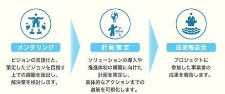 DX宣言事業者の中から10事業者程度選抜し、パートナーからの伴走支援により、ビジョン策定、課題把握、施策検討を実施します。