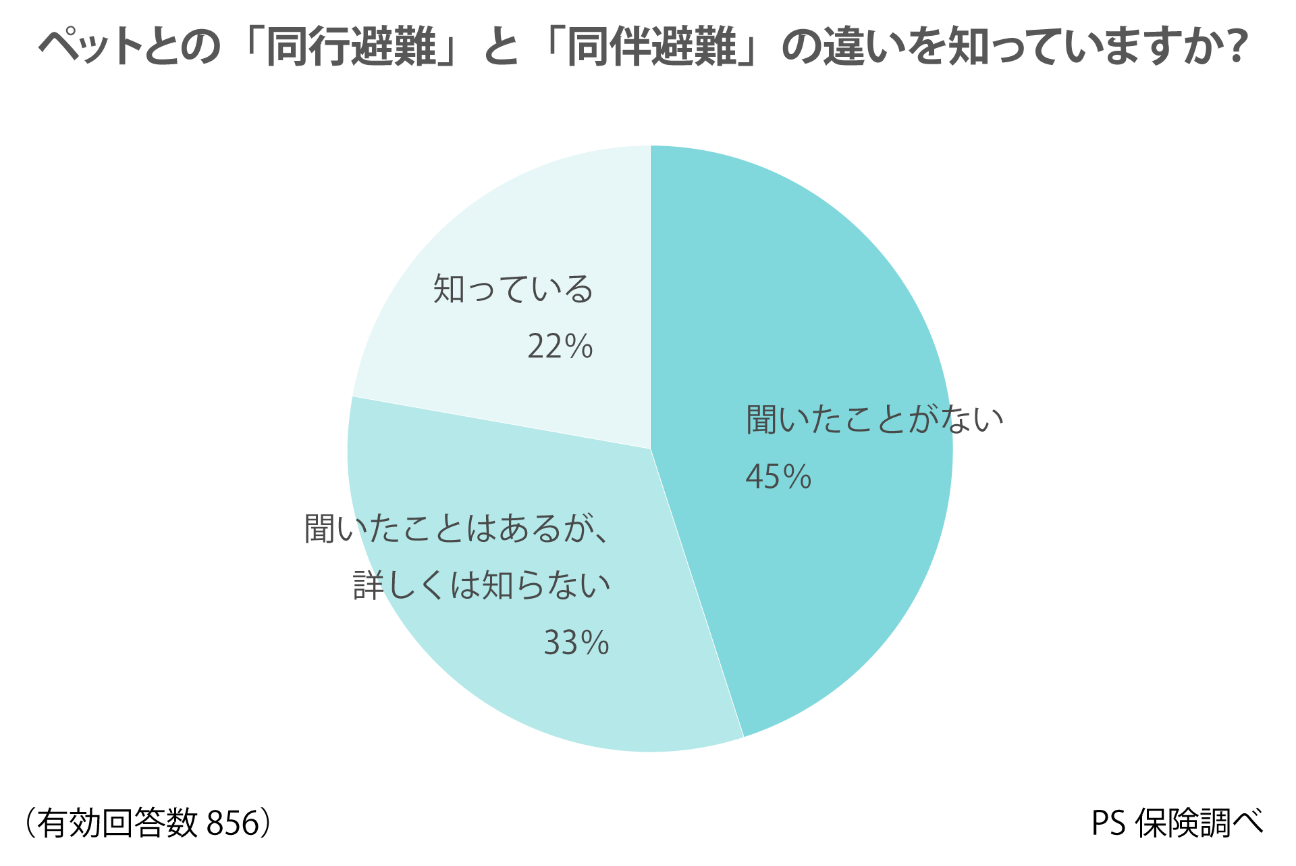 しかし、「同行避難」と「同伴避難」の違いを知っている飼い主は22%にとどまり、33%が「聞いたことはあるが詳しくは知らない」、45%が「聞いたことがない」と回答しました。