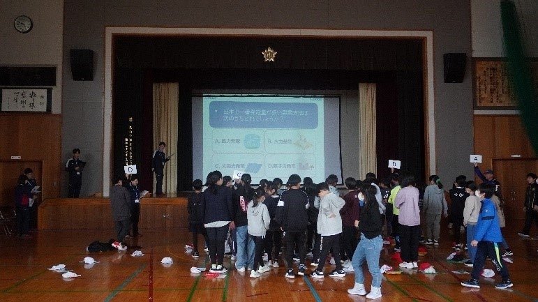 当日、まずは小学校の体育館で、再生可能エネルギーについて4択クイズの形式で楽しく学んでいただきました。講師を務めたのは、今年の4月にLooopに入社した新入社員です。