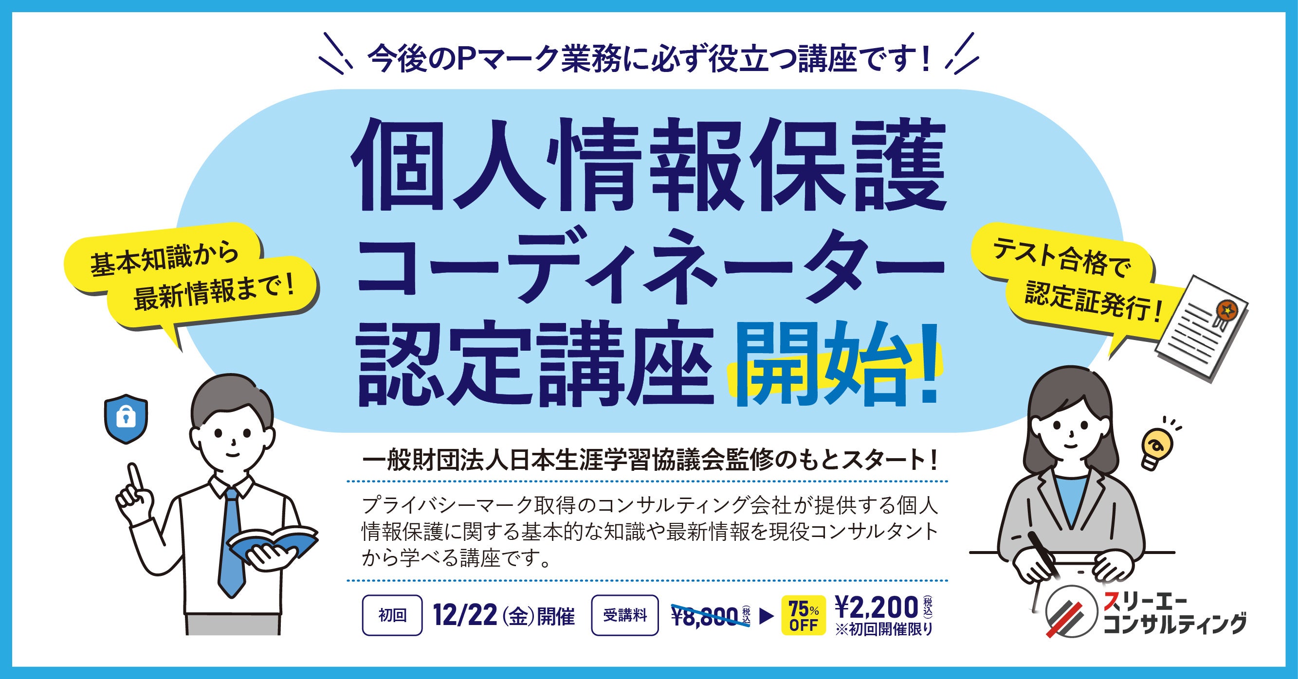 スリーエーコンサルティング、日本生涯学習協議会監修のもと『個人情報保護事務局実務コーディネーター認定講座(認定書発行あり)』開始!Pマーク運用をサポート