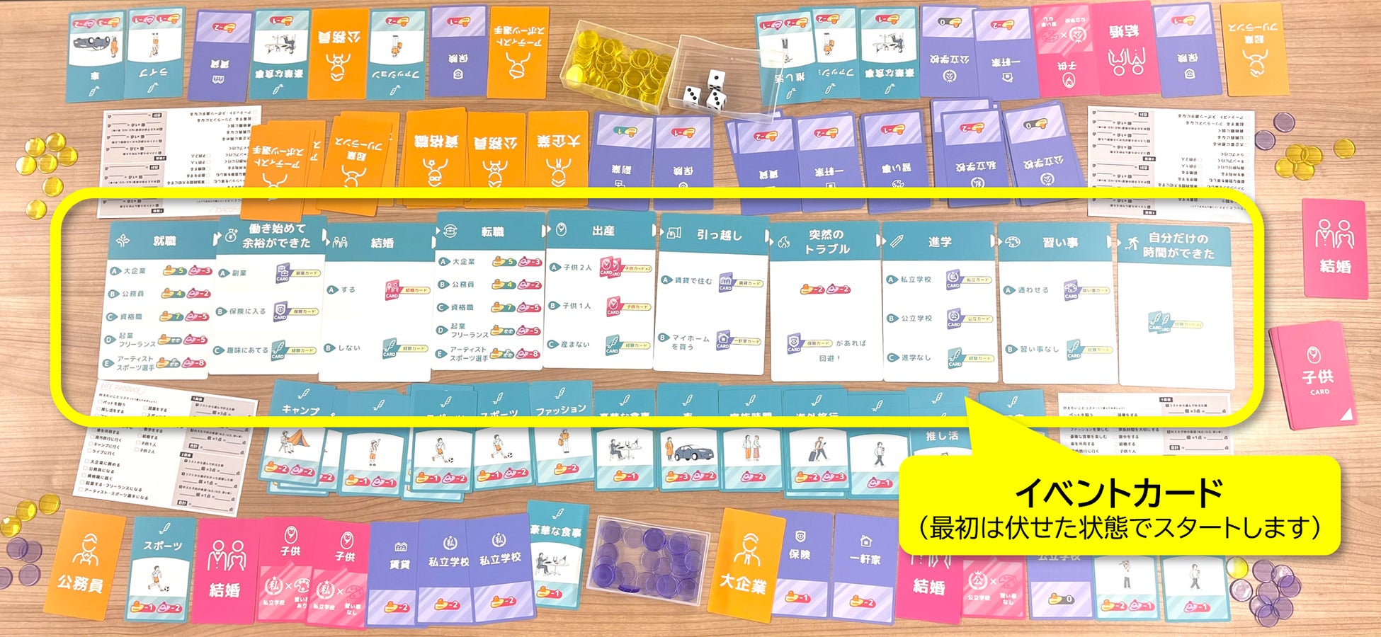 ❸ 人生のライフイベントを記載した10個の「イベントカード」に対し、様々な「選択」をしながら順に進めていく