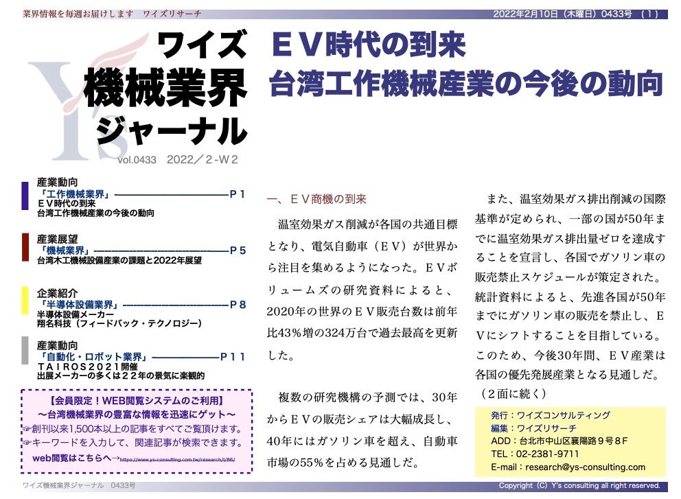 EV時代の到来 台湾工作機械産業の今後の動向<ワイズ機械業界ジャーナル2022年2月第2週号発行>