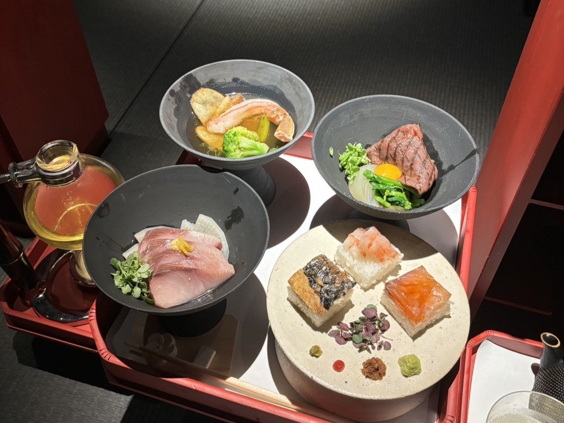 ◾️メニュー barrierでは、三方(さんぼう)をお膳として利用し、岡持ち(おかもち)に収められた三つのお椀料理に、サイフォンで抽出された一番出汁を注ぎます。 これにより、一杯のお出汁がお客様の食体験に奥深さと芳醇さを加えます。 barrierは、伝統的な日本料理のエッセンスを守りつつも、現代的なアプローチで新たな魅力を引き出すことを目指しています。 漆黒の空間で五感を研ぎ澄ませて、出汁に合う料理をお楽しみください。