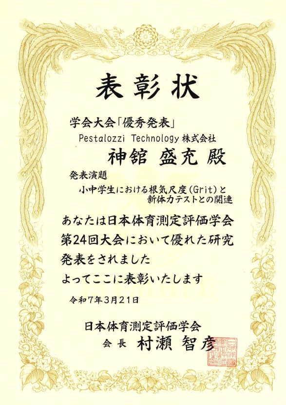 Pestalozzi Technology株式会社(本社:東京都新宿区、代表取締役社長CEO 井上 友綱)は、パーパスである「運動データを価値あるものに」を実現するために、健康・運動データを用いた研究活動・学会発表を2023年度より開始し、2024年度には社内研究機関として「日本健康・運動データ総合研究所」を設立しております。2024年度に行っていた研究のうち、非認知能力の一つである根気尺度(Grit)と新体力テストとの関連研究について、日本体育測定評価学会第24回大会にて優秀発表賞を受賞したことをお知らせいたします。