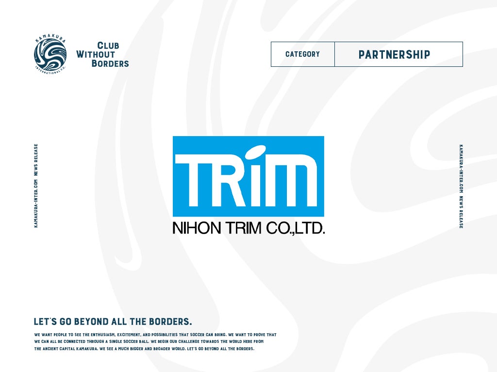 心身ともに健康なコミュニティの創生を目指し、株式会社日本トリム様にクラブパートナーとしてご支援をいただくこととなりました。生活に欠かせない水と鎌倉を拠点としたスポーツコミュニティを通じて、地域社会全体のウェルビーイングに貢献したいと考えております。皆さまがより健康で充実した生活を送れるように支援し、地域の活力と結束を高めていくために共に取り組んでまいります。