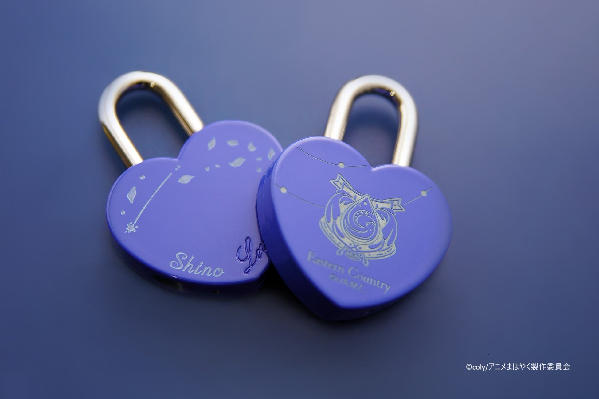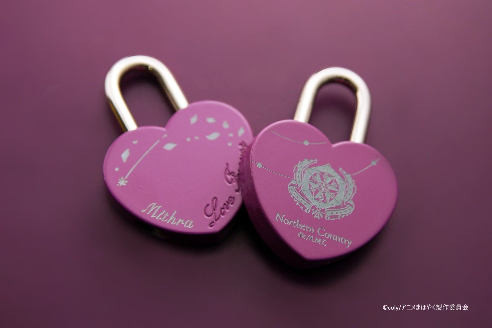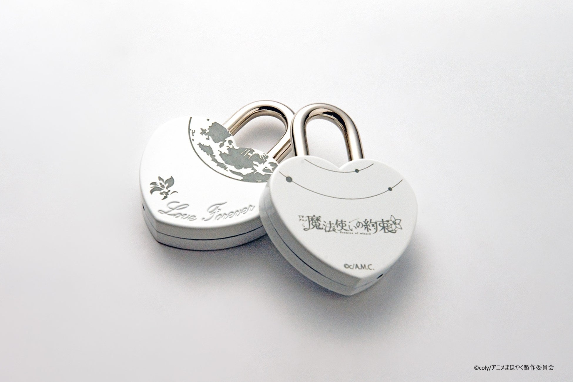 真っ白なハートロックに、表面はTVアニメ『魔法使いの約束』ロゴと星のめぐりを、裏面には月とユリの紋章がデザインされています。