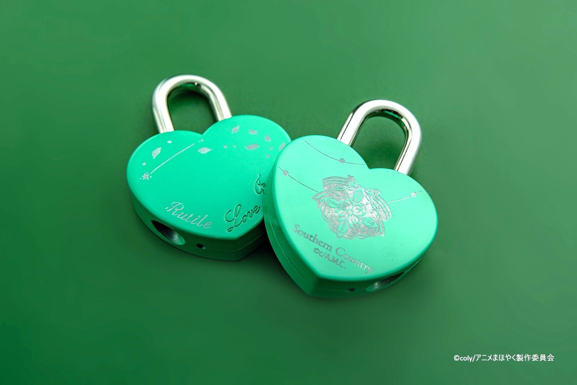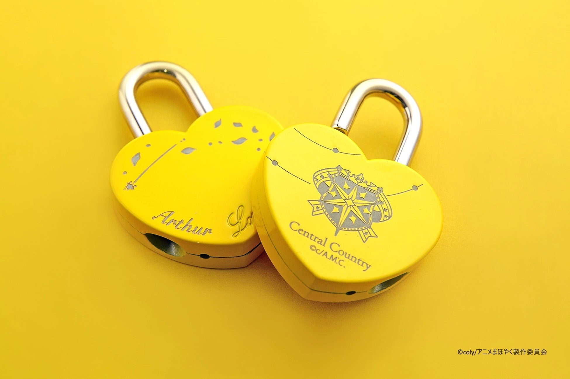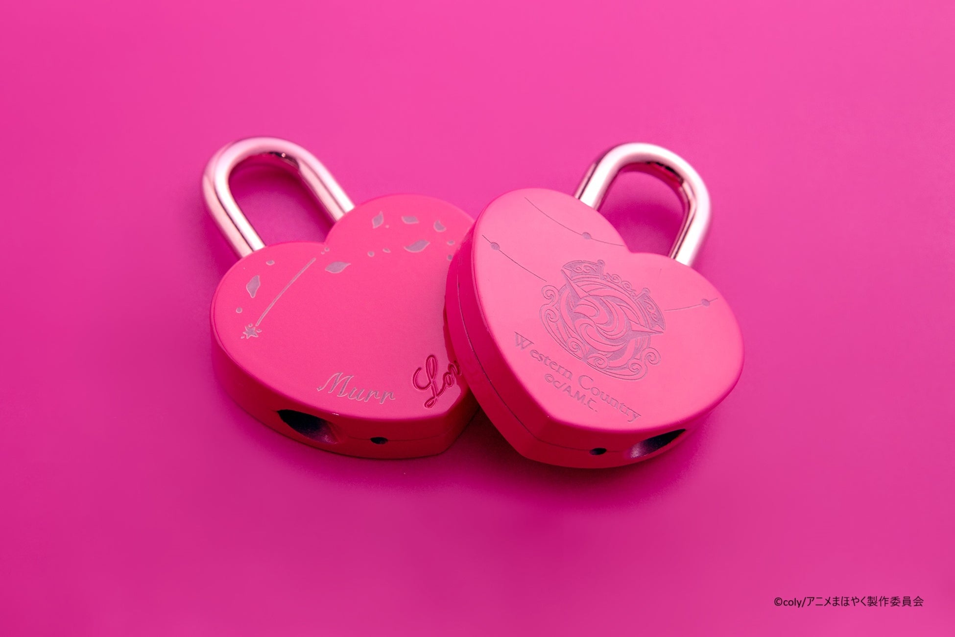 真っ白なハートロックに、表面はTVアニメ『魔法使いの約束』ロゴと星のめぐりを、裏面には月とユリの紋章がデザインされています。