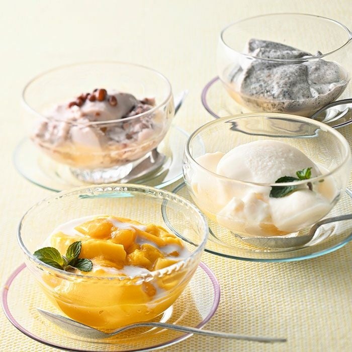 モダン中華の銘店の人気デザートをお届け。果肉たっぷりのマンゴープリンも芳醇で奥行きのある味わいにうっとり。てんさい糖を用いた杏仁豆腐とともに、濃厚ながら品のよい甘さが印象的だ。杏仁豆腐は、プレーン・十勝あん・黒胡麻の3種3様の美味が楽しめるのもうれしい。