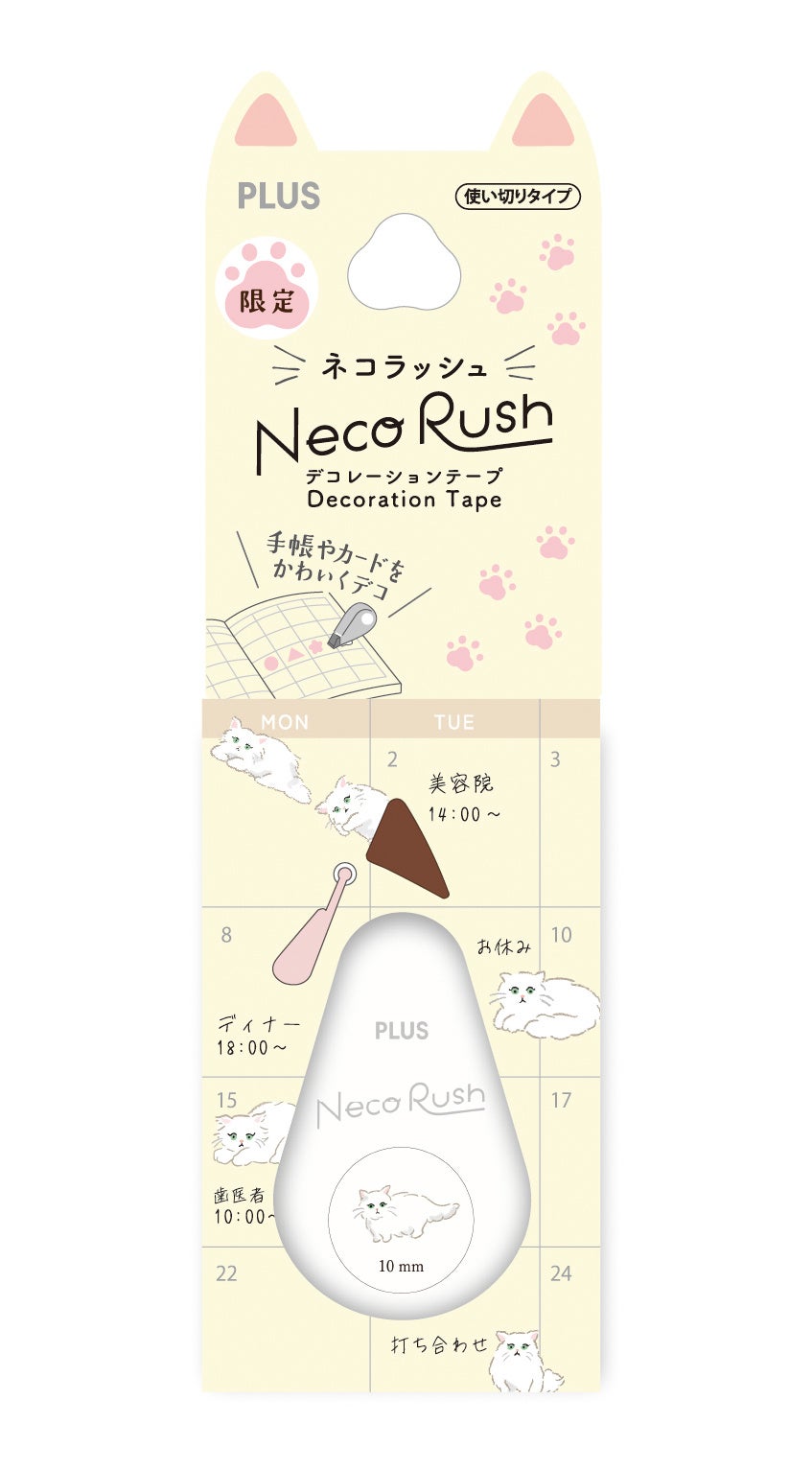 パッケージは猫耳&肉球をイメージしたオリジナルデザイン。本体先端の「ワンタッチキャップ」は肉球をイメージしたかわいいピンク色で愛らしさを演出。細部に至るまで「ネコラッシュ」ならではの遊び心を盛り込みました。