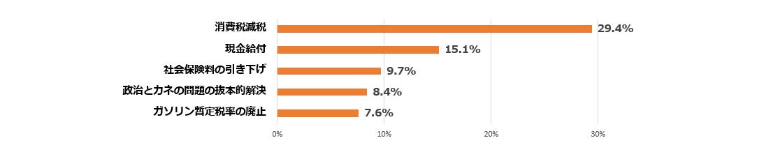 - 最優先の政策は消費税減税29%、現金給付15%、社会保険料下げ9%、政治とカネ対策8% -