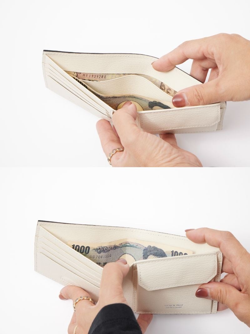こちらのモデルは、一見、いたってシンプルなデザイン。コインポケットは内側に設けられているため、財布を閉じた状態では表面に一切凹凸はなく、ゴートレザーの質感を存分に楽しめるデザインです。薄さは約2センチ。コインポケットを内側に設けている仕様としては、非常に薄いマチに仕上げられています。また、シンプルなデザインは、外側と内側のバイカラーコントラストをより一層際立たせます。
