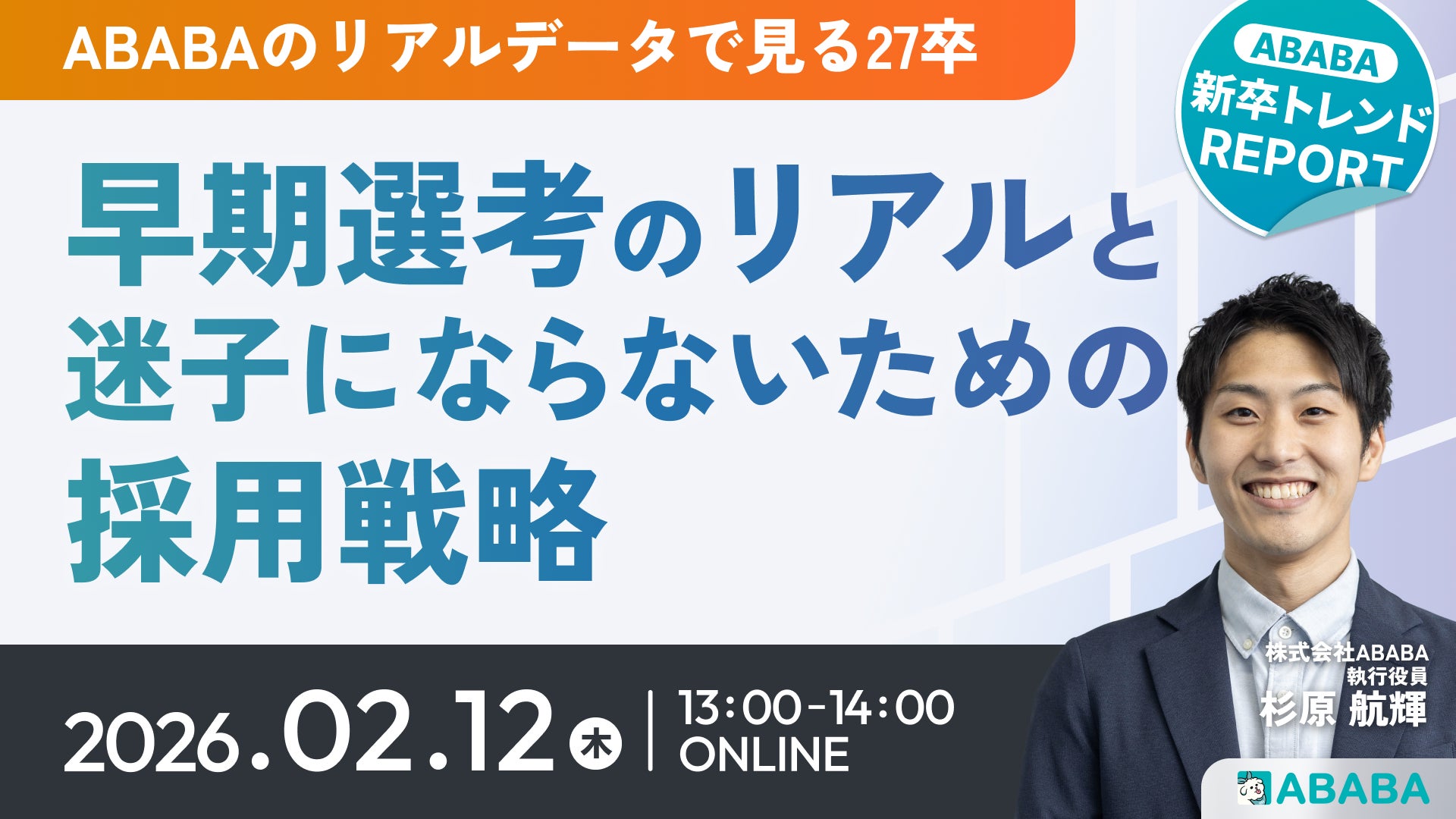 株式会社ABABA(本社:東京都渋谷区、代表:久保駿貴・中井達也)は、2月12日(木)に新卒採用担当者・責任者を対象とした無料オンラインセミナー『27卒・早期選考のリアルと“迷子”にならないための採用戦略【ABABA 新卒トレンドREPORT】』を開催いたします。