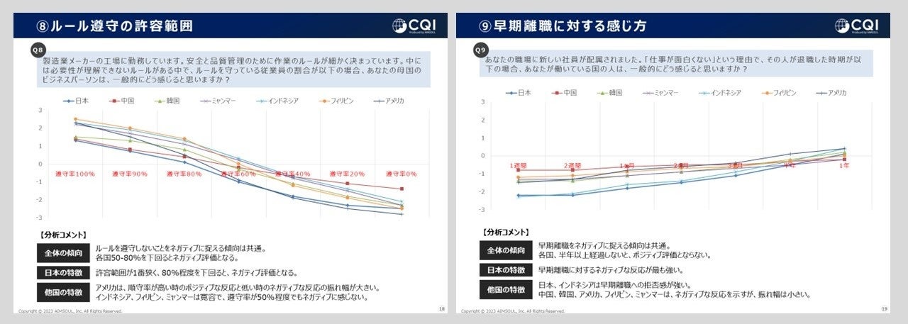 ●特に、「会議時間延長」「誤字脱字の数」「ルールの不遵守」「早期離職」については、7ヵ国の中で最も許容範囲が狭く、ネガティブ評価への振れ幅も大きい結果となっている。