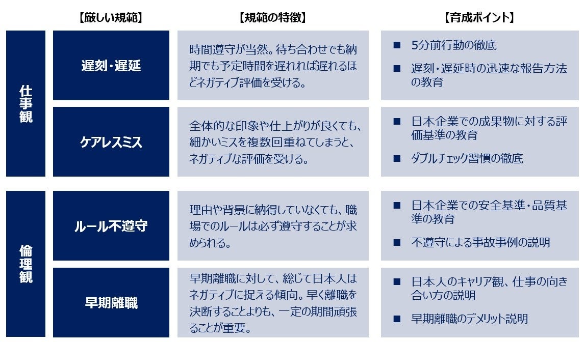 調査結果からは、日本の社会規範が他国よりも厳しい下記4要素への対応が、外国籍人材の育成ポイントと考えられます。