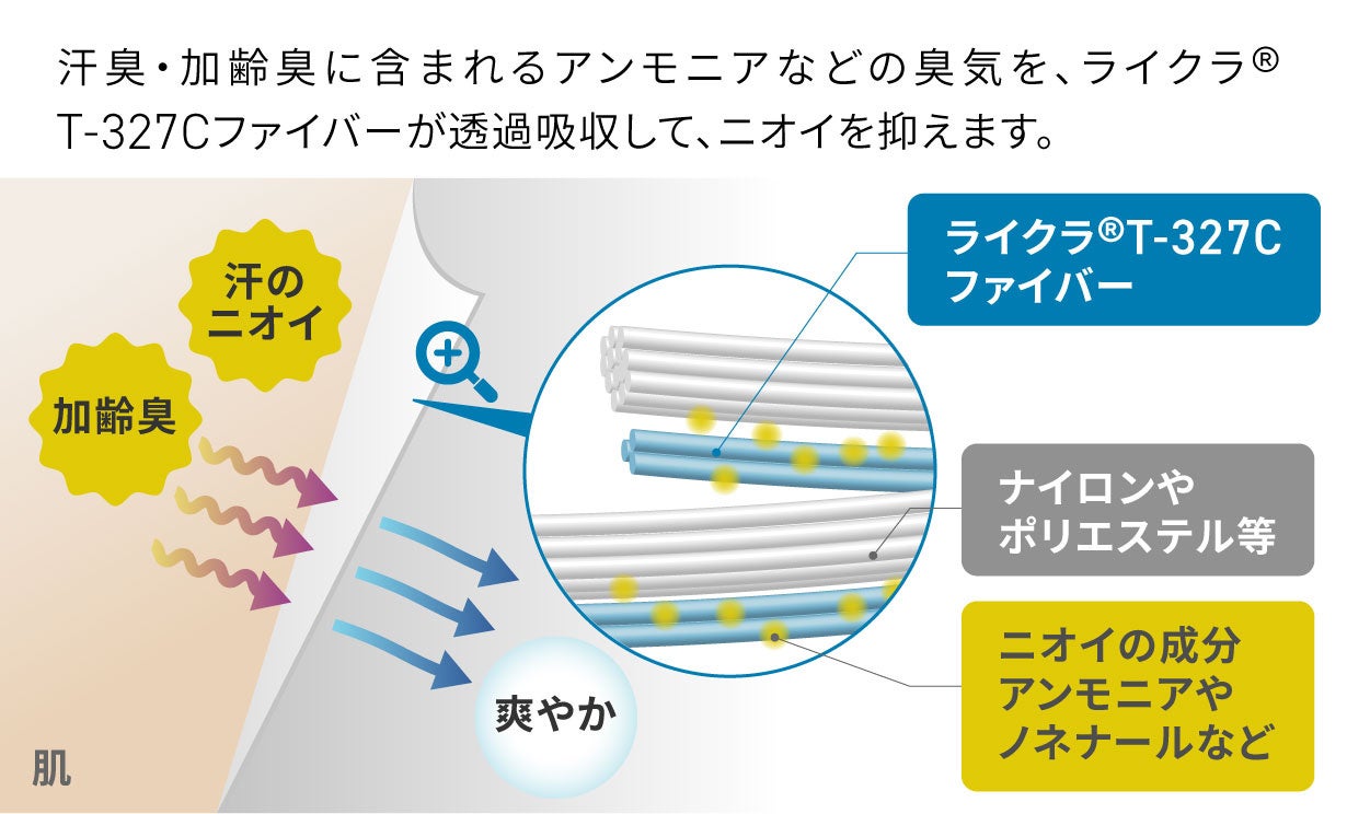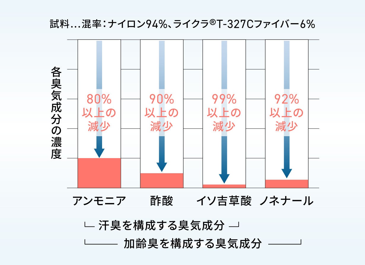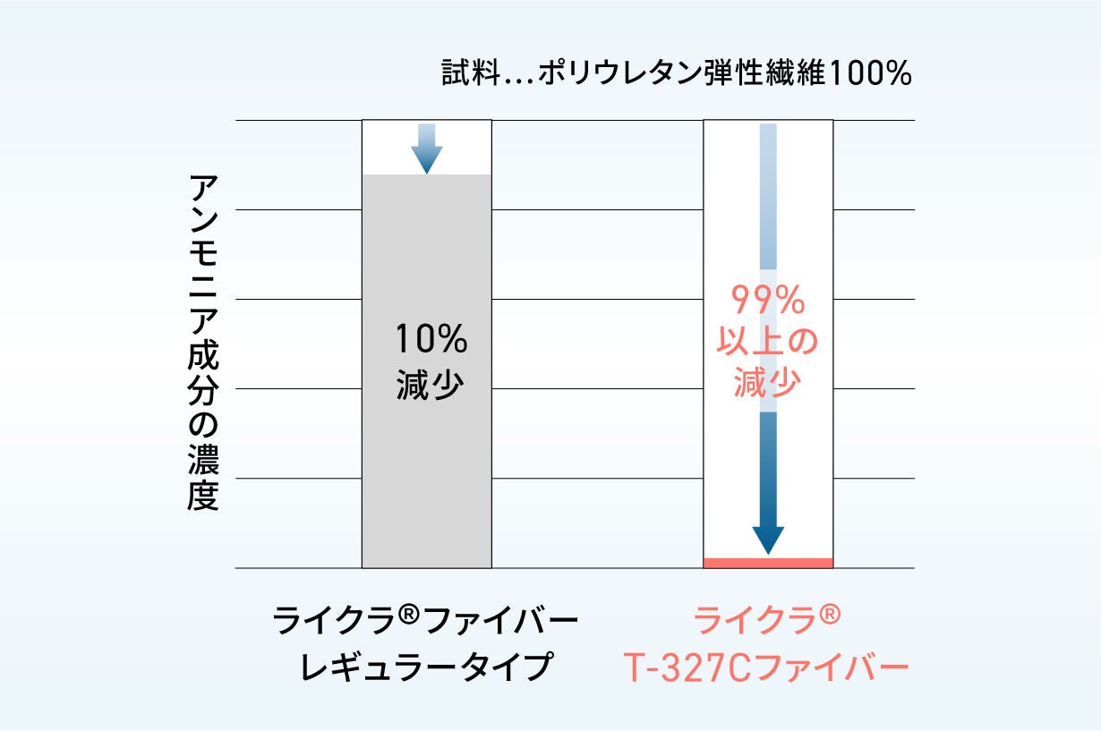「ライクラ®T-327Cファイバー」は、レギュラータイプのものに比べて消臭機能が強化されており、原糸だけの消臭性能試験において、汗臭に含まれるアンモニア成分がなんと99%以上減少!