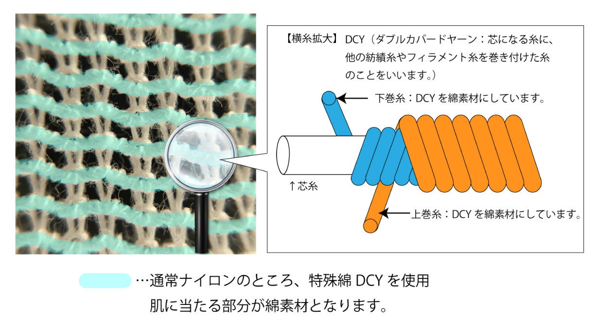 ライクラ®ファイバーを使用するだけでもニオイに対しては十分な効果がありますが、綿、ナイロン、分類外繊維(和紙)、ポリエステル部分にもニオイ対策を追加し、ダブルでニオイ対策を行っています。