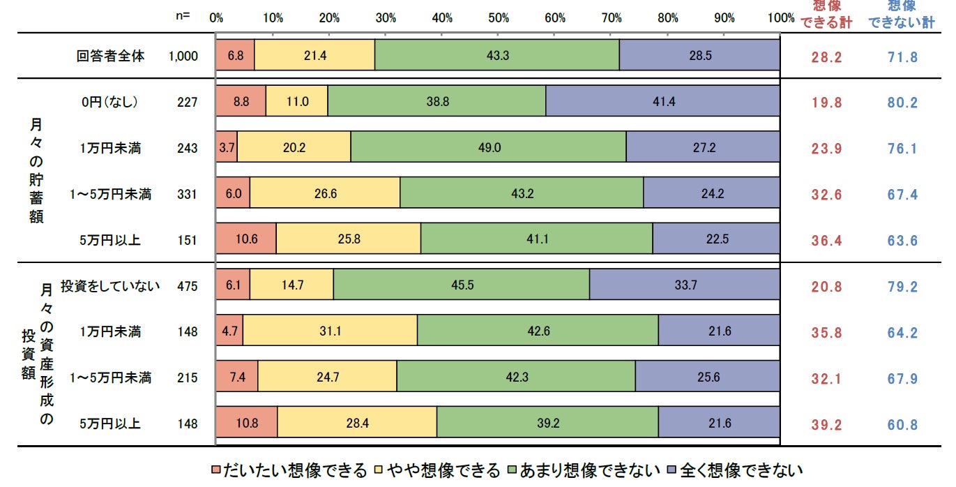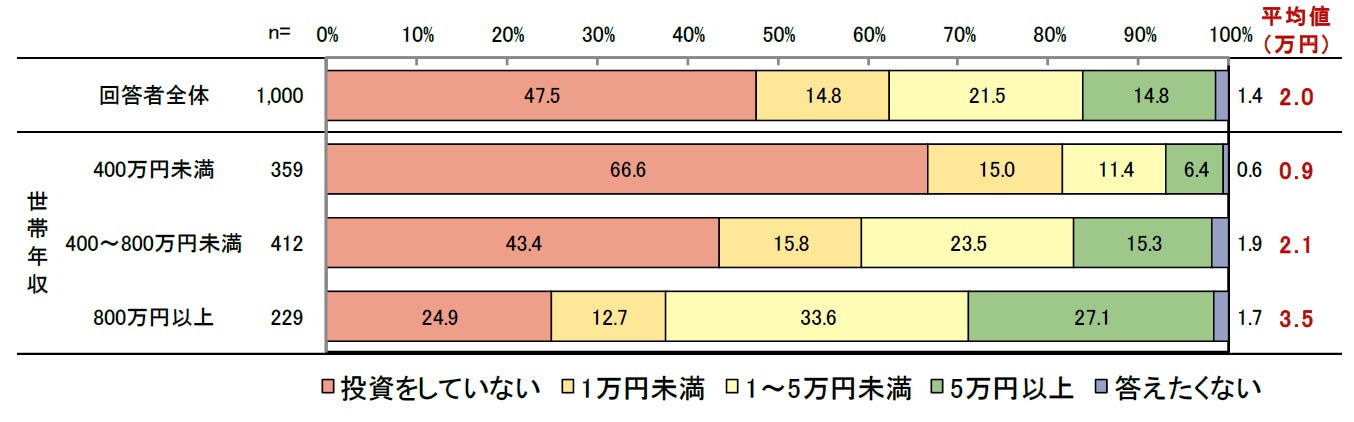 一方で、年収400万円未満の世帯では「資産形成のための投資をしていない」と答えた人が約7割でした。経済的な余裕がない世帯ほど投資に回すお金がない現状では、ライフプランを具体的に描き、将来のために投資を行うという、国が推進したい方向とはほど遠い状況であるともいえます。