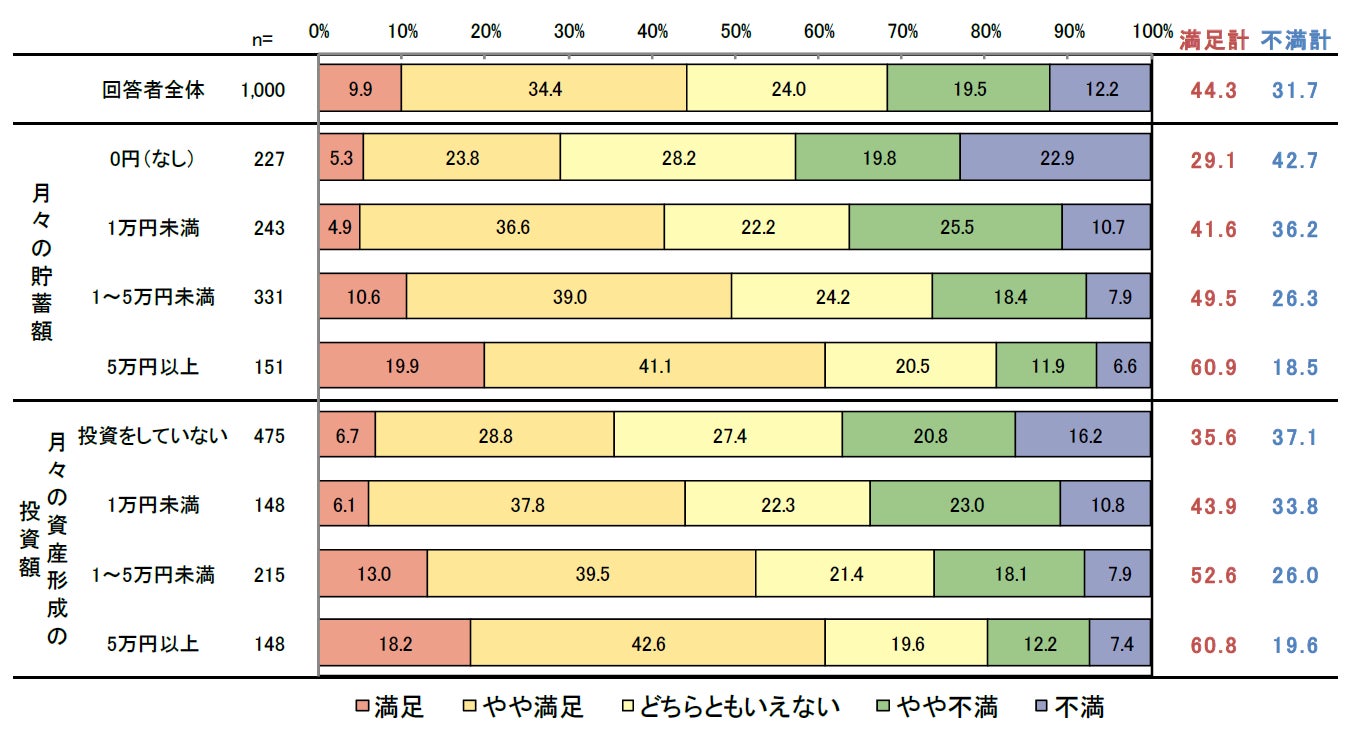 ■現在の生活の満足度について ・現在の生活に「満足」と回答した人は全体で9.9% ・毎月の貯蓄額や資産形成のための投資額が多い人は、現在の生活の満足度が高い傾向がある ・現在の生活に「満足」「やや満足」と答えた人の中で、満足度が低い項目は「貯蓄・金融資産(24.8%)」「収入(16.0%)」。満足度が高い項目は「家族関係(67.7%)」や「食生活(57.8%)」 |