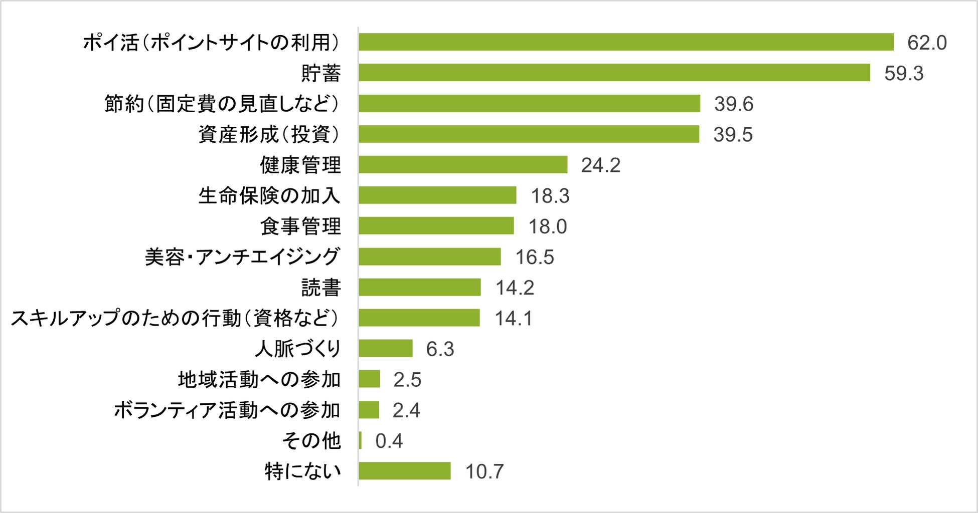 ■将来について ・83.7%が自身の将来に不安を感じている ・毎月の貯蓄額や資産形成のための投資額が多い人は、将来への不安は小さい傾向がある ・具体的な将来の不安は「給料や年金(男性20代)」「育児の経済的な不安(女性30代)」や「老後資金(女性30代)」など ・10年後の自身について「想像できない」と回答した人は全体で71.8% ・将来に向けて現在行っていることは、「ポイ活(62.0%)」や「貯蓄(59.3%)」が主 |