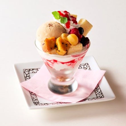 イタリアンマロンの芳醇な香りと栗の粒を楽しめるジェラートに中学いもや栗の甘露煮、ミックスベリーを添えた秋の味覚たっぷりのパフェです。
