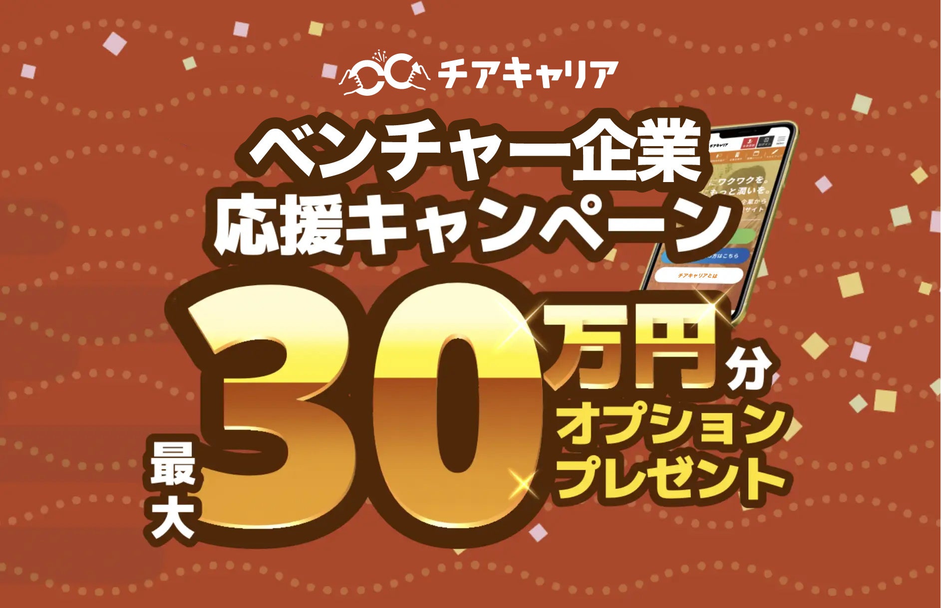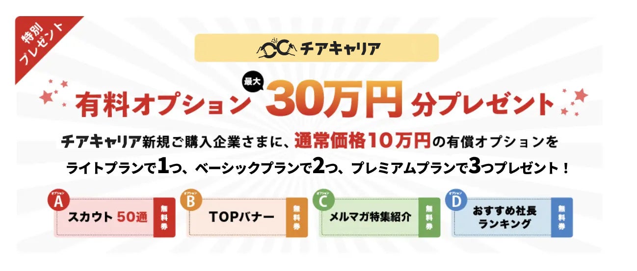 キャンペーン期間中にチアキャリアに新規でお申し込みいただきました企業様に有料オプションを最大30万円分プレゼントさせていただきます。
