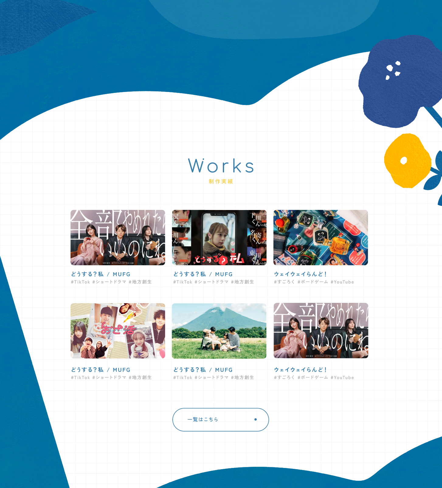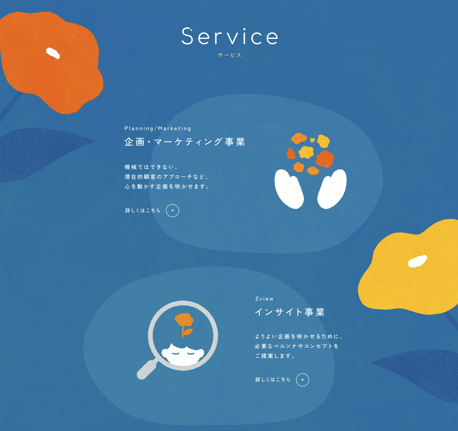 また、ページ内に散りばめられた色とりどりの花々は、メンバーや多彩な企画を表すもの。花のデザインはあえて統一せず、個性豊かなイメージを反映させました。