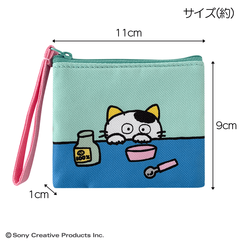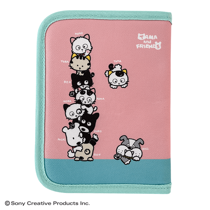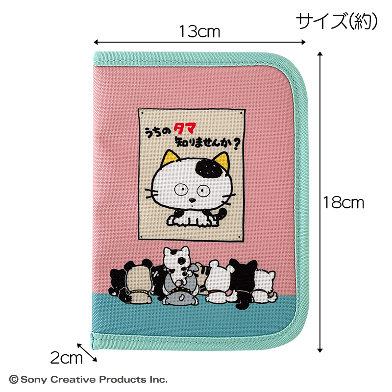 通帳やカード、小物などが入れられるファスナー付きのマルチケースです。表は、昔なつかしい「うちのタマ知りませんか?」のポスターを仲間たちが眺めているデザインです。