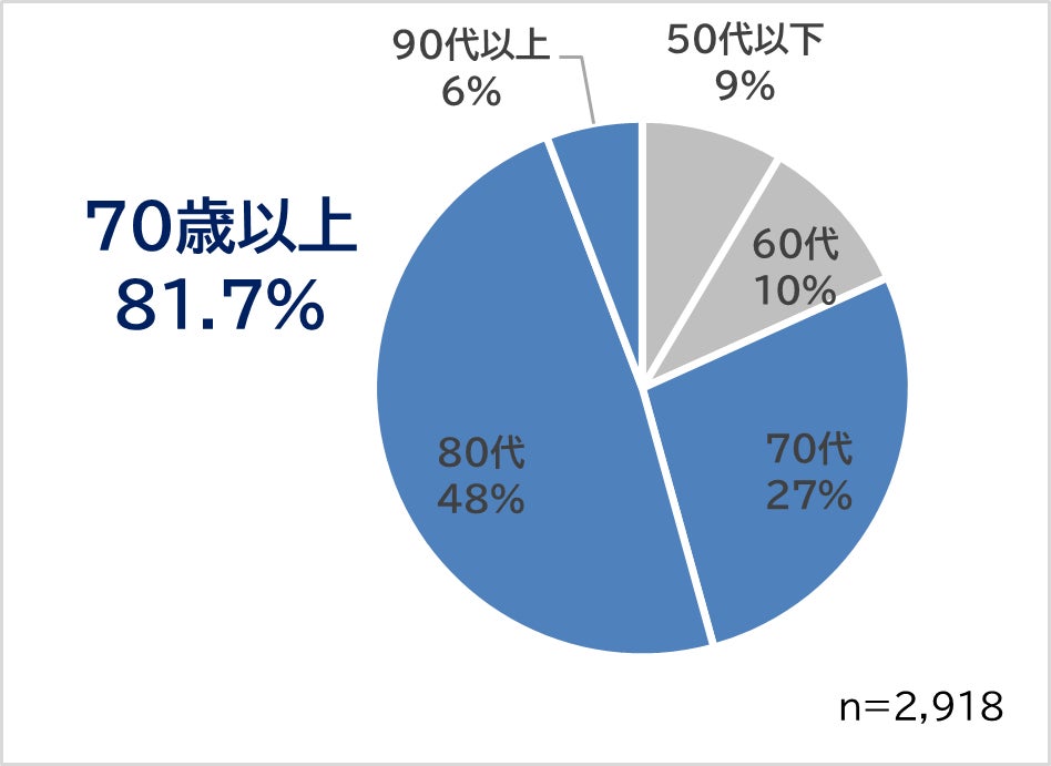 一方、近年オレオレ詐欺や還付金詐欺に代表される特殊詐欺は手口を変えながら巧妙化し、警視庁の特殊詐欺関連統計によると、2023年の特殊詐欺被害の認知件数は19,033件、被害額は441億となっています。うち、東京都の被害件数は全国トップであり、認知件数は2,918件と前年より減少した一方、被害金額は81.5億と増加(図1)しており深刻な社会問題となっています。なかでも特殊詐欺被害者の81.7%が70歳以上の高齢者(図2)です。