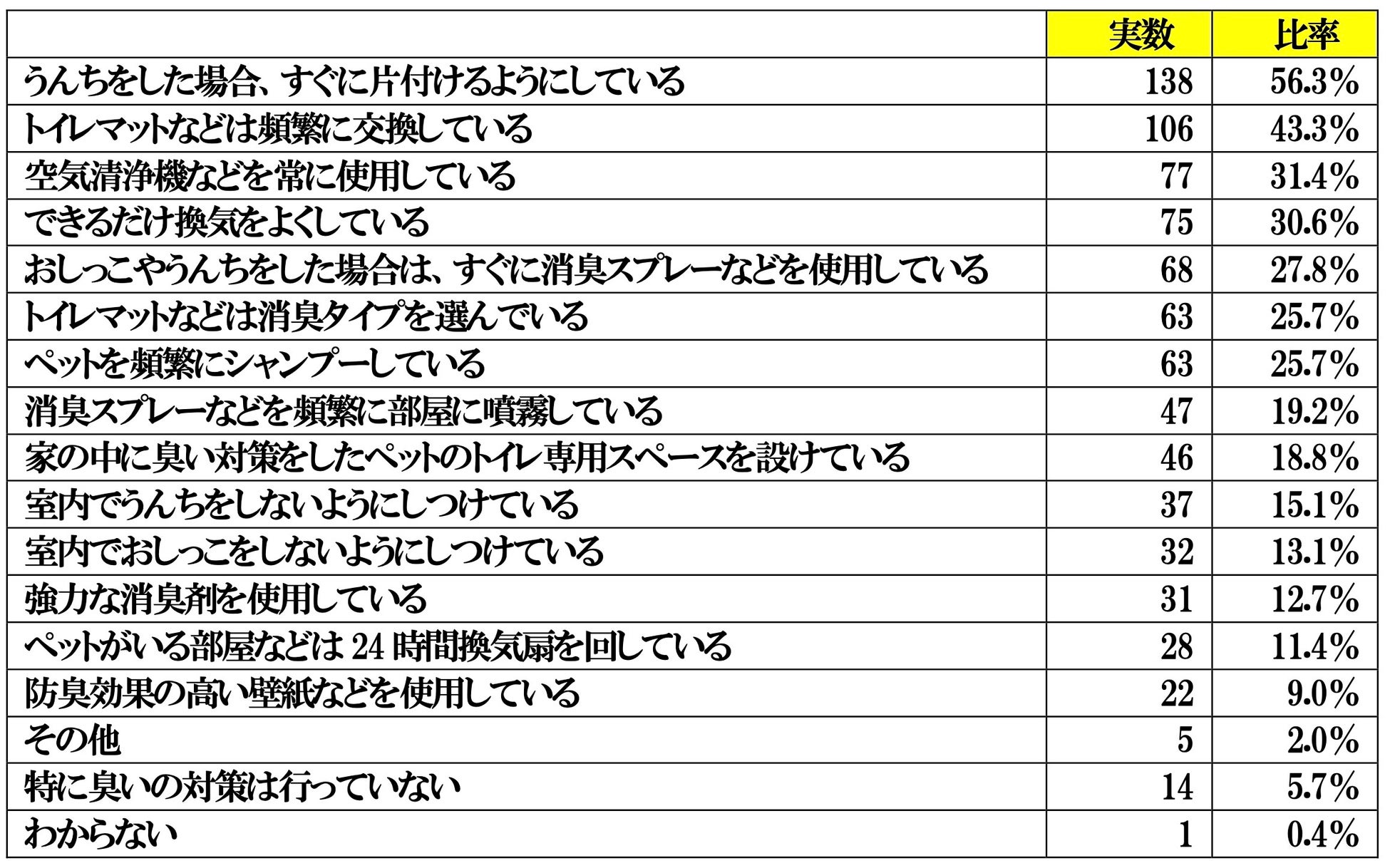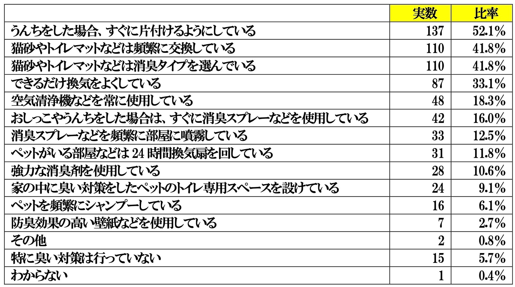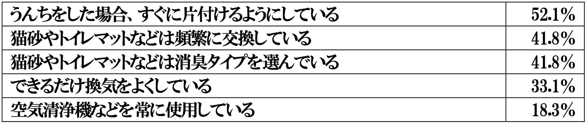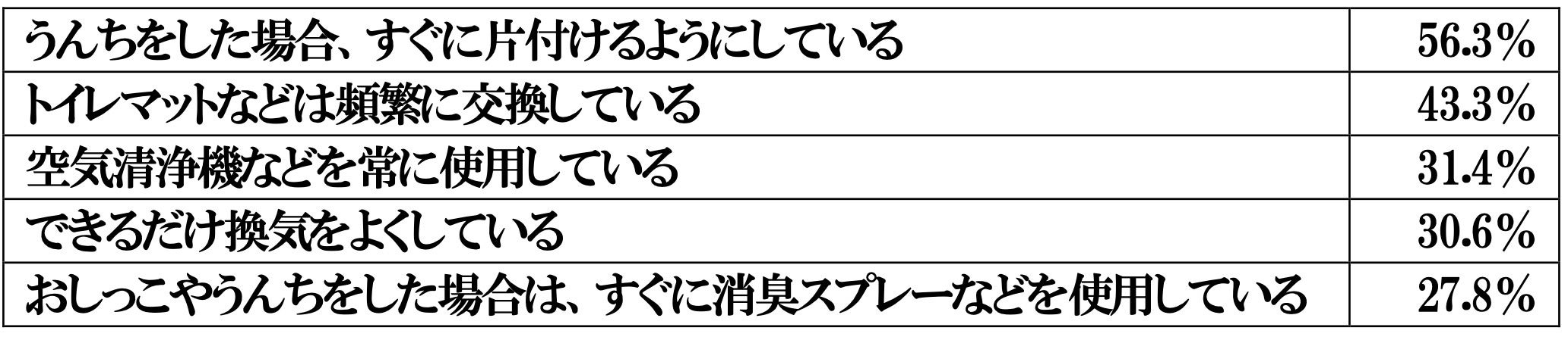 これらの気になる臭い対策としては、犬を飼っている方も猫を飼っている方も、「うんちをした場合、すぐに片付けるようにしている」が最も多く、続いて「猫砂やトイレマットなどは頻繁に交換している」となっています。また「空気清浄機などを常に使用している」「できるだけ換気をよくしている」なども上位となっており、臭いがこもらない対策が多いようです。しかし、このような臭い対策を行なっても、あまり臭いを抑えられていない方が3割弱となっています。