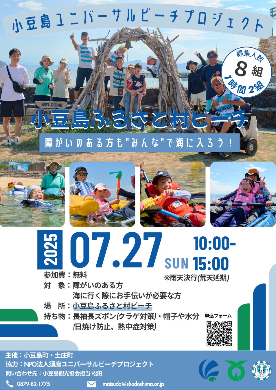 小豆島町・土庄町では、持続可能な観光推進事業の一環として、障がいのある・なしに関わらずだれもが海を楽しむことができる環境の整備を目指し、2024年よりユニバーサルビーチプロジェクトの実施に取り組んでいます。昨年は島内外から計6組のご家族にご参加いただき、小豆島の美しい海を満喫し、笑顔のあふれる1日となりました。今年もSDGsの「誰一人取り残さない」という観点から、小豆島ふるさと村において水陸両用車椅子やビーチマットを使ったイベントを開催し、サステナブルな観光を推進していきます。