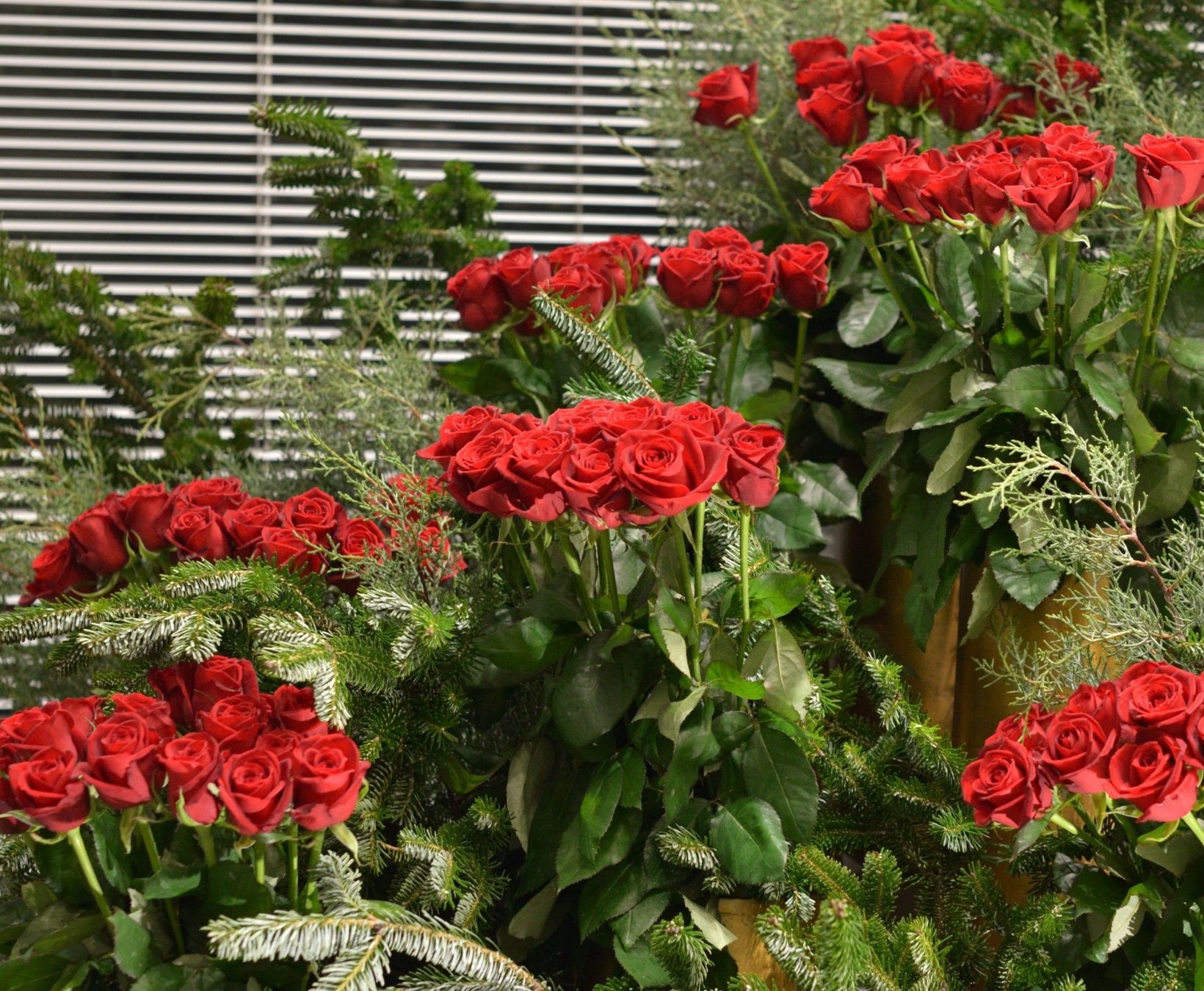 ゴールドに輝く花器に一輪一輪丁寧に生けられた深紅のバラは、まさに「バラのクリスマスツリー」を表現し、バラの産地への深いこだわりと、日比谷花壇日比谷公園本店が誇る高品質な花をご堪能いただけます。