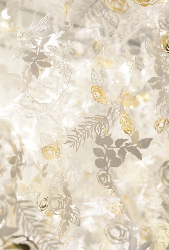 本インスタレーションの核となるのは、「nekonekodesign PAPER ARTS」菅野一剛氏がデザインしたオリジナルペーパークラフトです。クリスマスのテーマである「バラ」をモチーフとし、最高品質の赤いバラを引き立てるホワイトとゴールドのカラーリングで仕上げています。このペーパークラフトは、植物由来のバイオマス樹脂を一部使用した環境配慮型素材を使用しており、バラが織り成すラグジュアリーな美しさと、サステナビリティへの配慮を両立させています。店内では、高さ約7.5メートルの窓にかけられたブラインドにペーパークラフトの繊細な影が照明によって映し出され、店内のバラのディスプレイと相まって、建物全体が一つの芸術的なインスタレーションとして来場者をお迎えします。