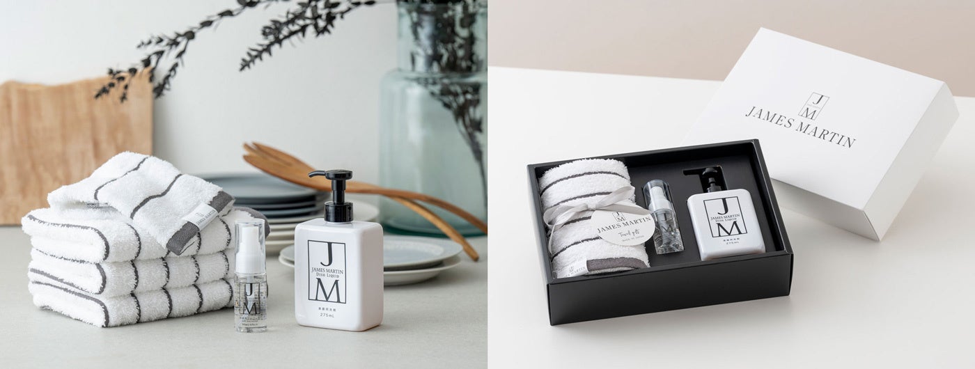 ジェームズマーティン フレッシュサニタイザー、食器用洗剤ディッシュリキッドと、抗菌加工を施した柔らかな肌ざわりの泉州タオルをモノトーンのスタイリッシュなボックスにセットしたどなたにも贈りやすい日本製のギフトです。