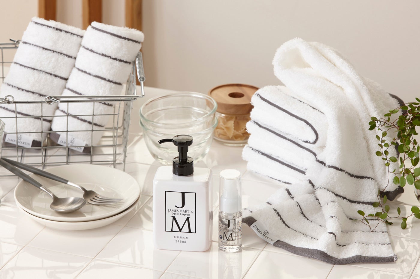 この度発売するタオルギフトは、ジェームズマーティンの特徴であるシンプルなデザインに併せたグレーのボーダー柄の抗菌加工タオルと、ジェームズマーティンの定番商品の食品成分のみで作られた安心安全なアルコール製剤 フレッシュサニタイザー、手肌にやさしく少量で汚れが落とせる食器用洗剤ディッシュリキッドをセットにしたギフトです。タオルは、タオルの産地である泉州にて、デザインだけでなく吸水性や抗菌加工にもこだわり、ふんわり柔らかな風合いに仕上げました。キッチンや洗面所などお使いいただくもの、持ち歩き用のものなど毎日のいろいろな場面でお使いいただけるギフトセットです。是非この機会に、大切な方へのプレゼントに、毎日使える高品質なアイテムが詰まったジェームズマーティンのタオルギフトを贈ってみてはいかがでしょうか。
