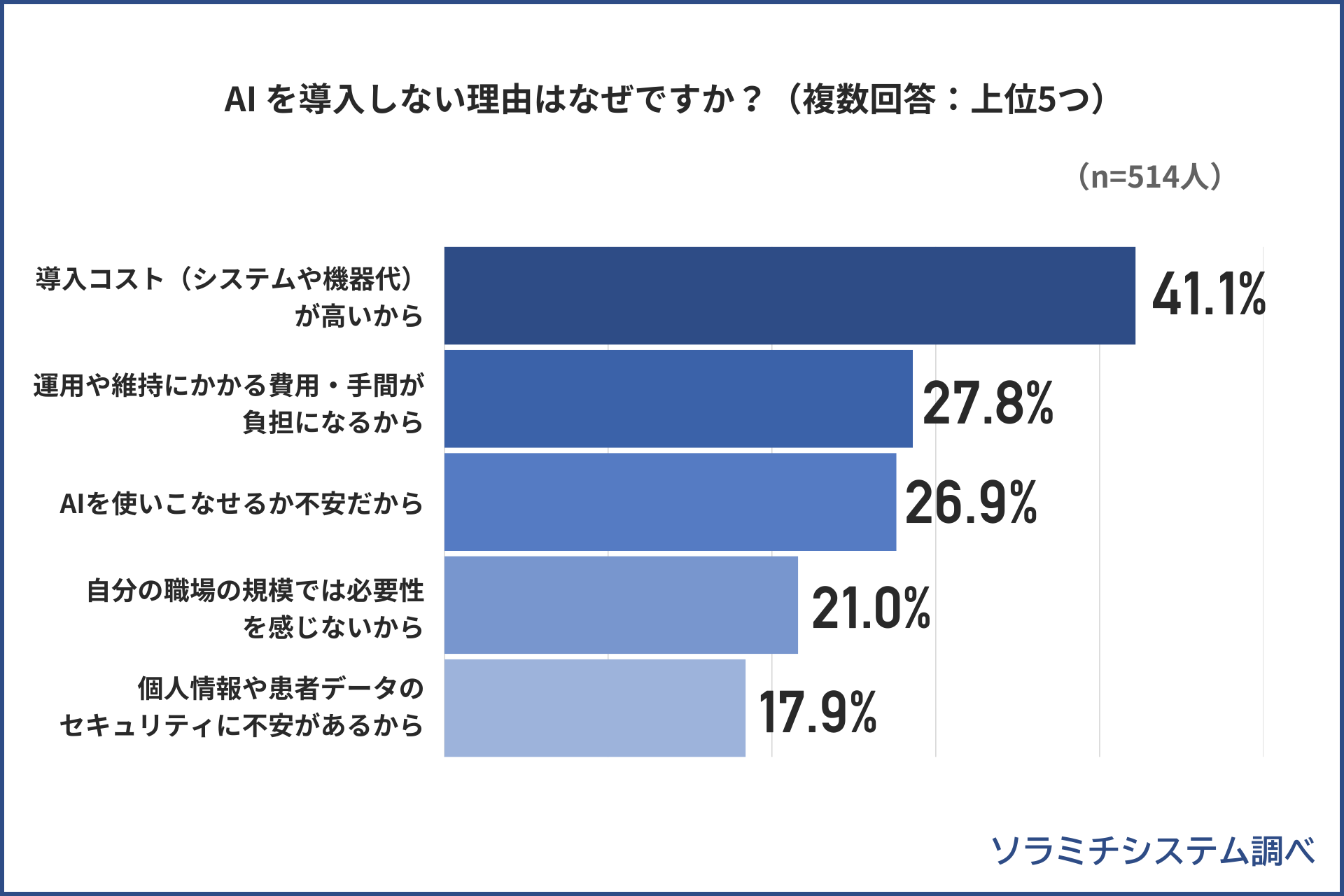 一方、「導入していない」と回答した人の理由(複数回答)としては、「導入コスト(システムや機器代)が高いから」41.1%が最も多く、「運用や維持にかかる費用・手間が負担になるから」27.8%、「AIを使いこなせるか不安だから」26.9%と続き、主にコストや運用負担、リテラシー面での不安が導入の壁となっている現状が明らかになりました。